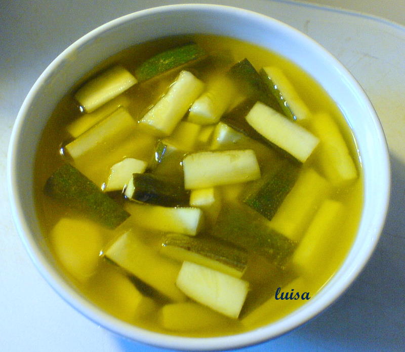 Mettere nel coperchio chiuso"coperchio chiuso" l'aceto con lo zucchero, l'olio, il sale, l'aglio e il basilico: 8 min 100° vel velocità soft"velocità soft" , tuffarvi le zucchine: 2 min 100° antiorario"antiorario" vel velocità soft"velocità soft"