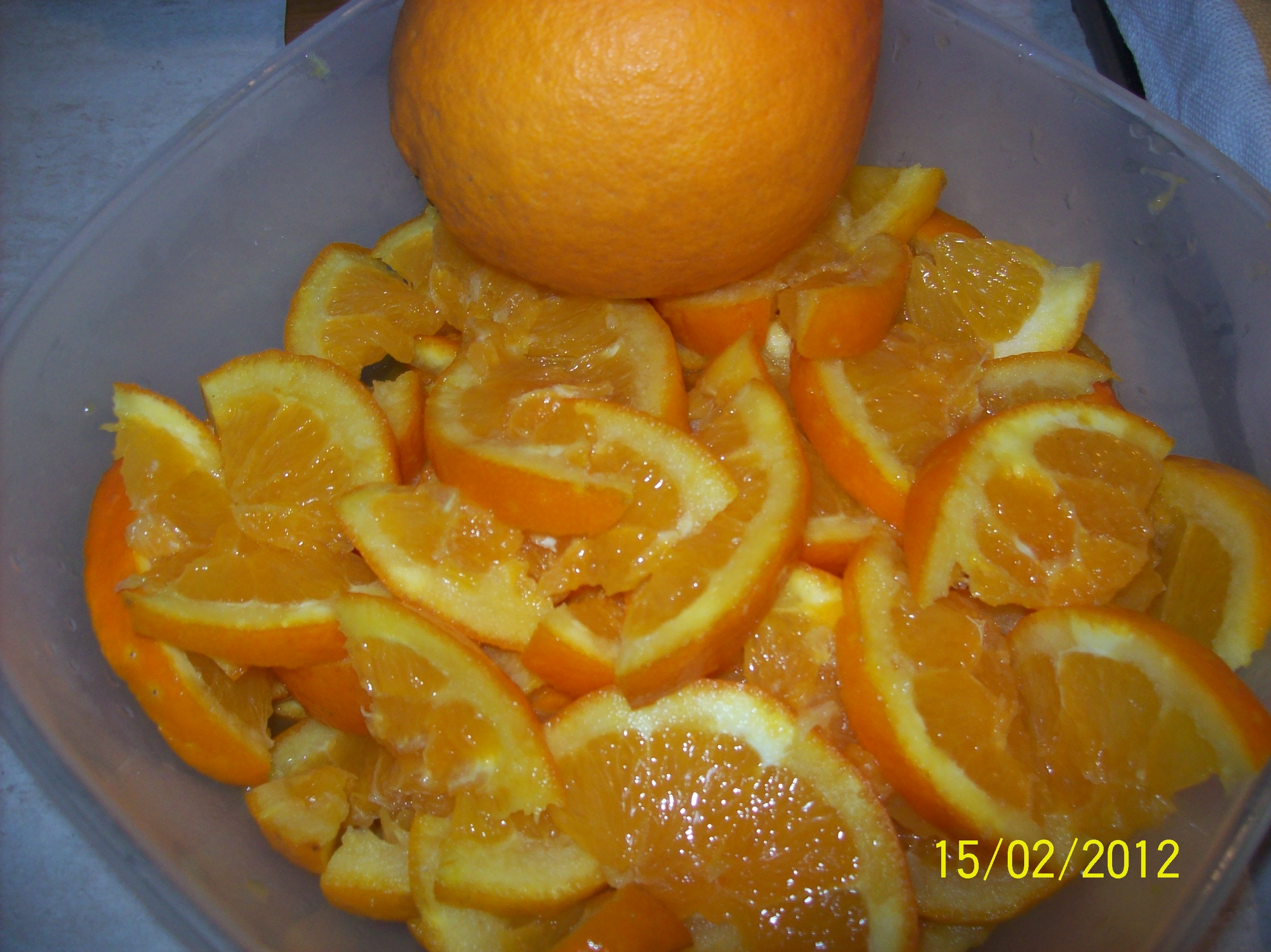 Bucherellare le arance solo la buccia mettere a bagno in acqua fredda per 48 ore sostituendola 4 volte al giorno. Tagliare le arance a fettine sottili ed orizzontali.