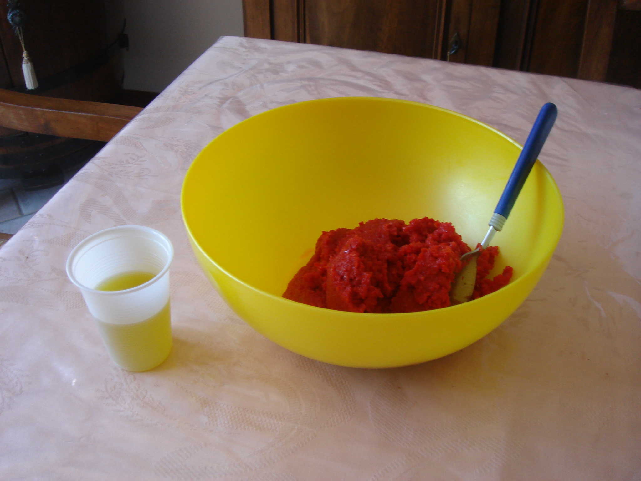 il giorno seguente mettere il composto in una ciotola ed emulsionare  metà bicchiere di  l'olio , mettere nei vasetti  e coprire con il restante olio