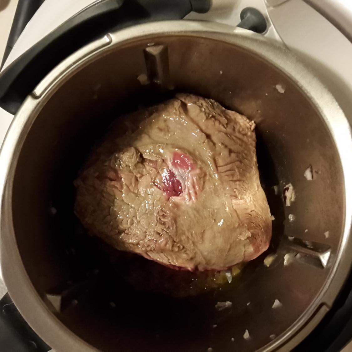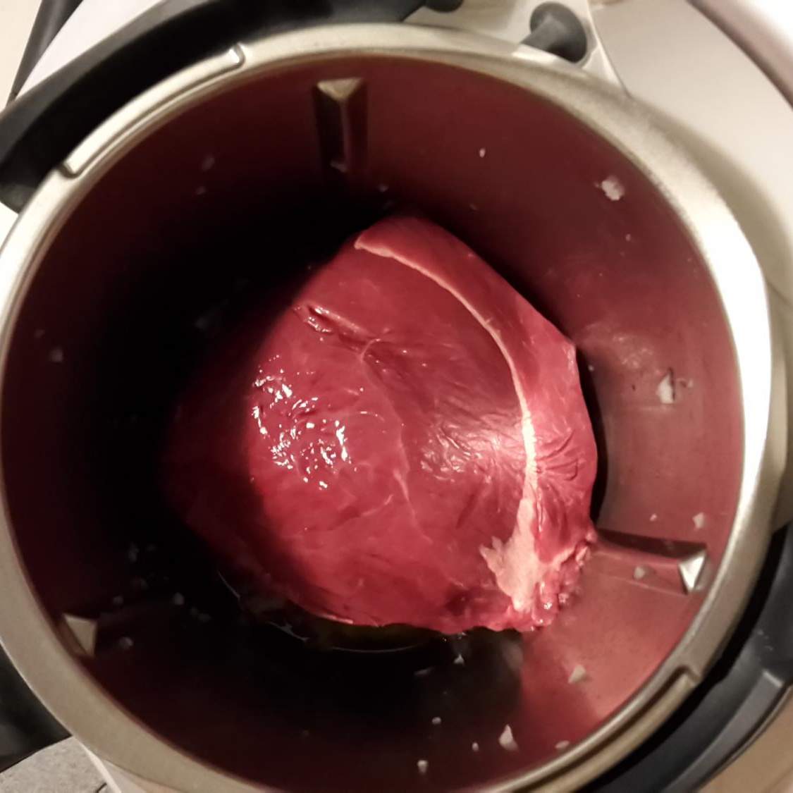 "coperchio chiuso" , tritare per 6 sec vel 5, riunire sul fondo con la spatola. Versare l'olio e posizionare l'arrosto sulle lame. Far rosolare per 3 min 120°