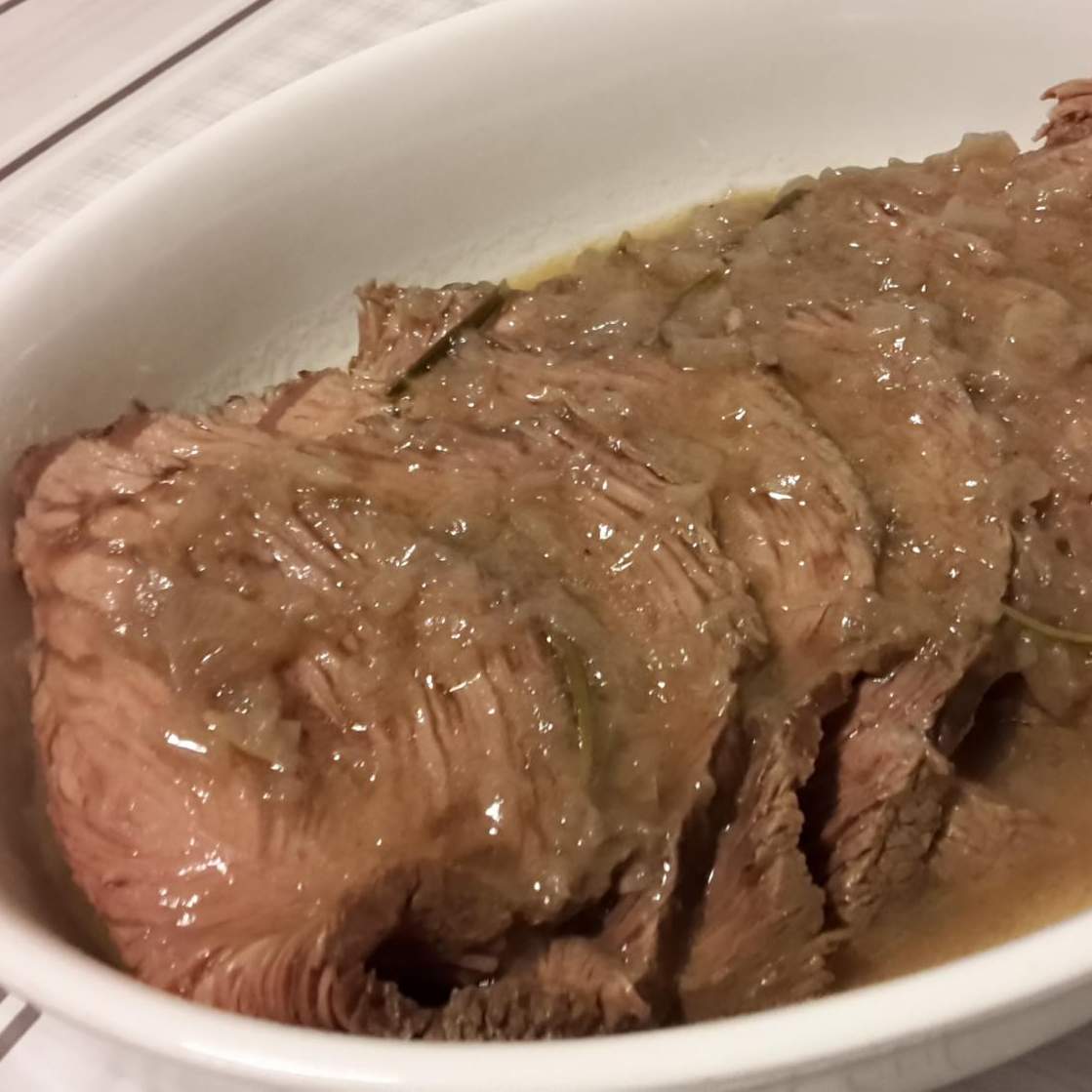 5. Tagliare l'arrosto a fette e irrorare con il sugo rimasto nel