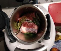 L'oliocottura è una modalità di preparazione che ben si adatta al Bimby. In special modo al TM6 perchè si può programmare la funzione cottura lenta e utilizzare il coprilame per non rovinare la carne. L'olio non viene assorbito dall'alimento bensì serve come involucro per la cottura. I liquidi presenti nella carne rimangono all'interno senza essere dispersi nell'olio durante la cottura a 70° costanti (altro grande vantaggio nell'utilizzo del Bimby). Ciò permette di avere, in questo caso, un filetto tenerissimo e di un bel colore rosato. Si può mangiare anche freddo o tiepido.