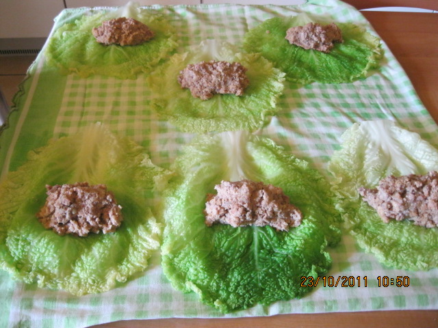 "antiorario" vel 3.Mettere sopra ogni foglia un pò di ripieno e arrotolare formando un bauletto. Legare con uno spago.