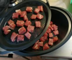 5 min. 120° vel. 1 - Nel frattempo ungere con poco olio il vassoio ed il varoma e distribuire uniformemente al suo interno i bocconcini di arista marinati.
