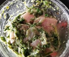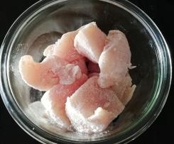 Nel frattempo infarinare i bocconcini di pollo e metterli in un vaso da 370 ml. - Versare sopra il condimento ai bruscandoli, aggiungere il sale, pepe e il latte.