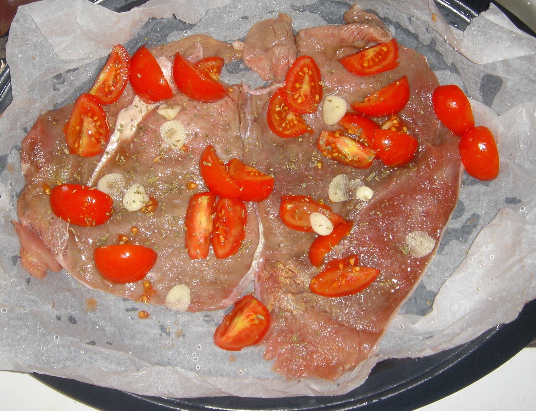 Mettere le fettine di carne e distribuire il condimento a pezzettini.