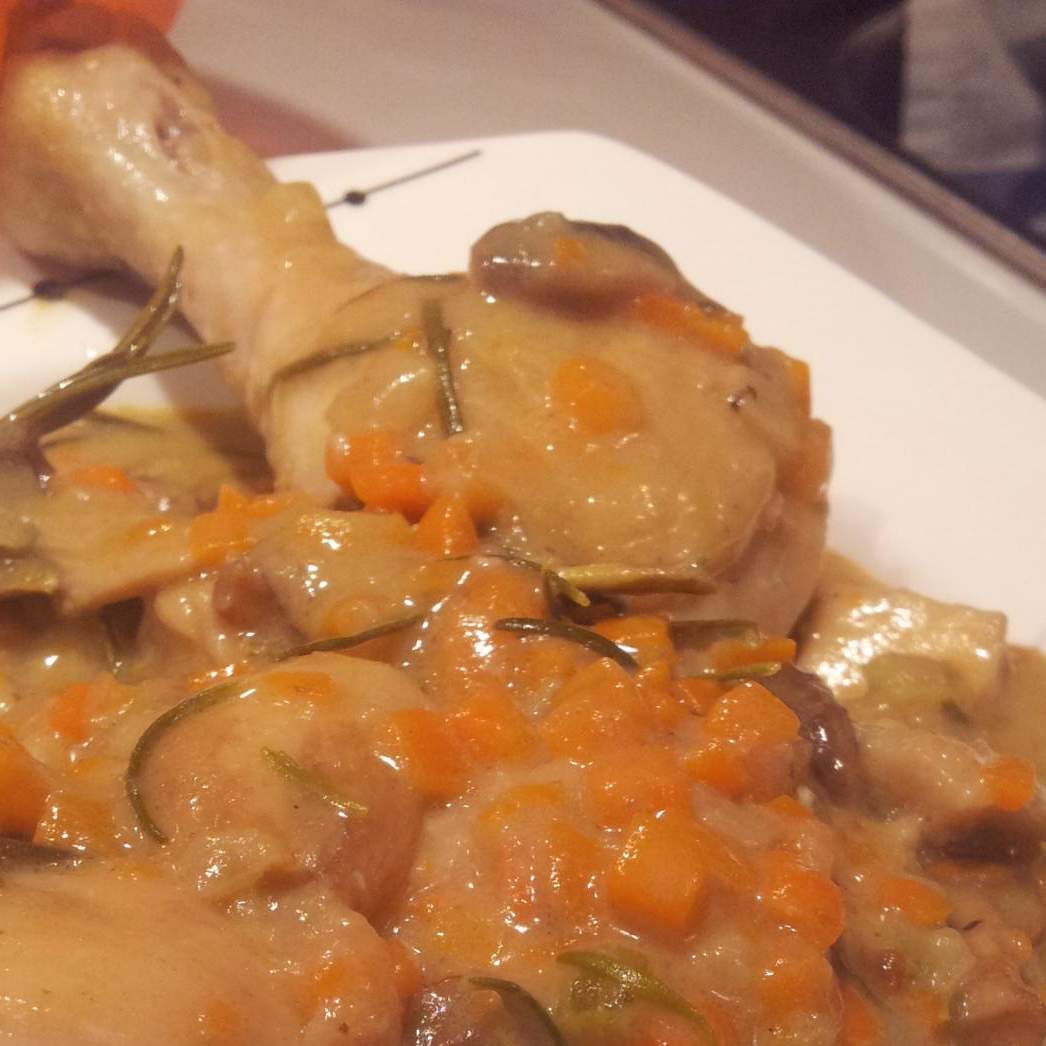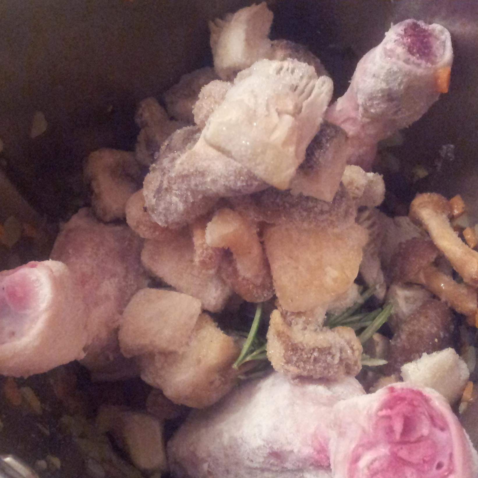 Aggiungere le coscette precedentemente infarinate,(inserendole tra le lame), i funghi, il rosmarino e il dado. 10 min. temp. Varoma