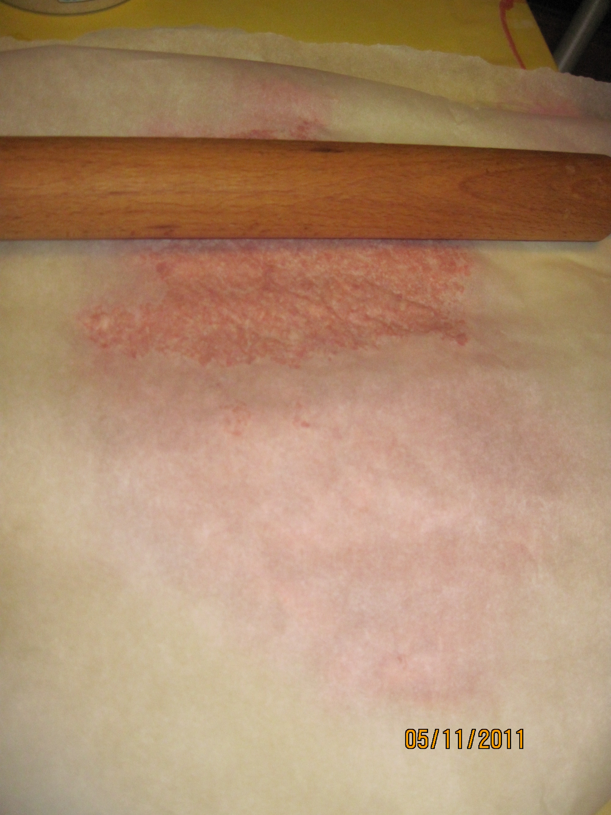 Stendere su carta da forno l'impasto e aiutandosi coprendo l'impasto con carta da forno, stendere l'impasto con un mattarello di uno spessore di 1/2 cm.