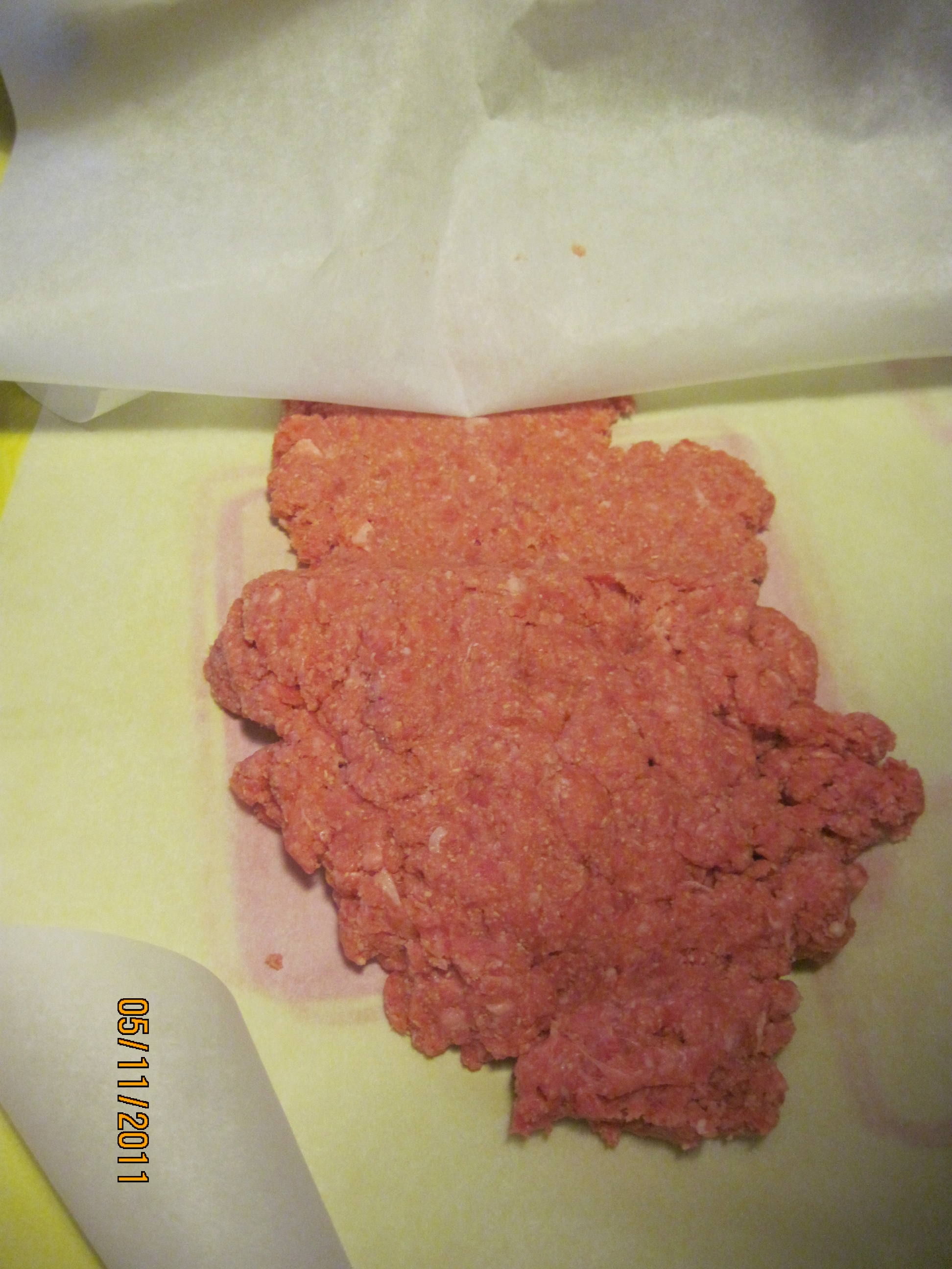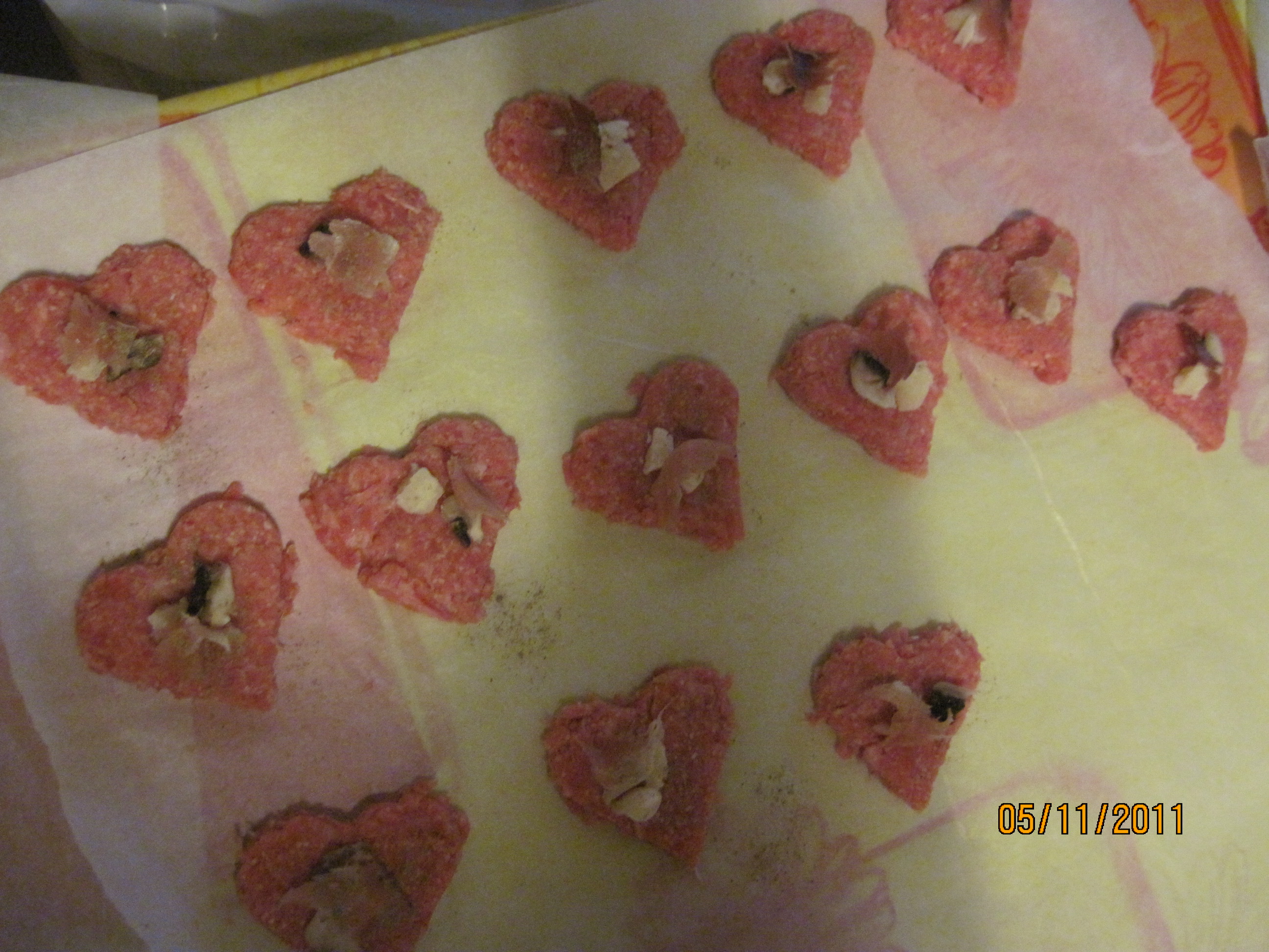 Con uno stampo tagliabiscotti a forma di cuore ritagliare l'impasto di carne precedentemente steso.