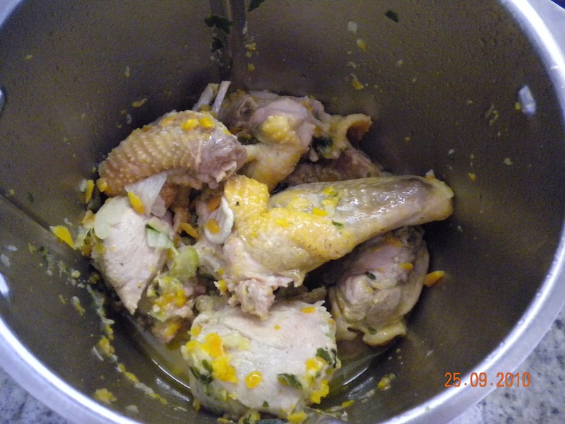 Inserite nel boccale tutti gli aromi a tritateli a vel. 7, inserite la faraona a pezzi e cuocete 45 minuti