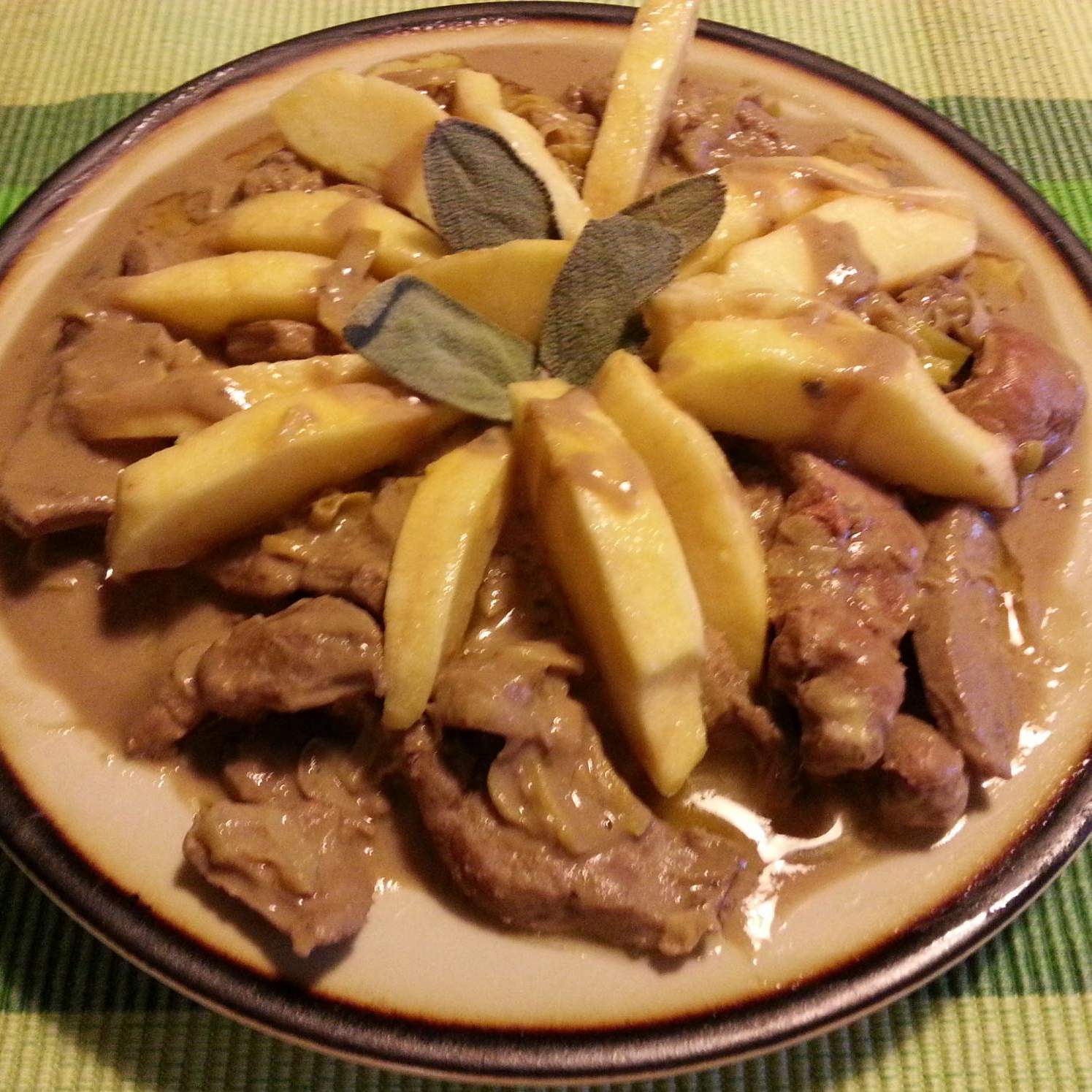 Questa ricetta mi è stata ispirata dalla ricetta dei fegatini di pollo di Miss V, che ringrazio molto, perchè la sua ricetta è davvero gustosa. L'ho "mixata" con una ricetta altoatesina e devo dire che il connubio di porro, senape, salvia, fegato, salsa che si forma in cottura e mela è davvero interessante e particolare, come lo è anche secondo me il connubio tra la morbidezza del fegato e la croccantezza della mela. Buon Appetito!