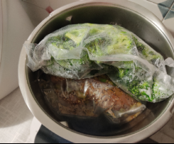 4. 4. Posizionare nel coperchio chiuso"coperchio chiuso" il Frullare"Frullare" e inserire i due sacchetti con il pollo e i broccoli. Coprire con acqua calda fino alla capienza massima (2,2 l) e procedere alla cottura Sottovuoto"Sottovuoto" per 1h e 30m a 75°. Dopo un'ora togliere il sacchetto dei broccoli (che richiedono per la cottura un tempo inferiore).