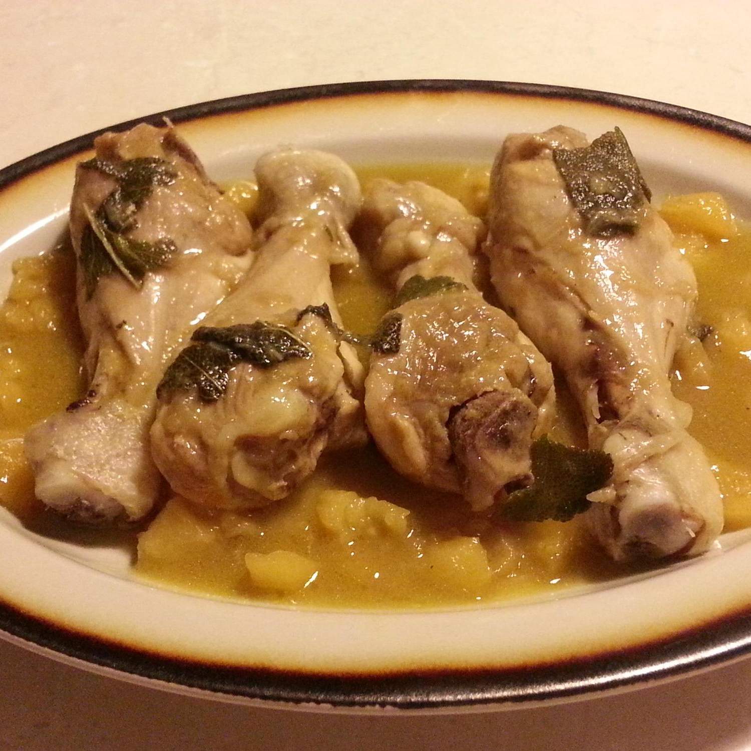 Prendere un piatto da portata e distribuirvi i pezzetti di mela caramellati, adagiarvi i fusi di pollo versandovi sopra la salsa di cottura.