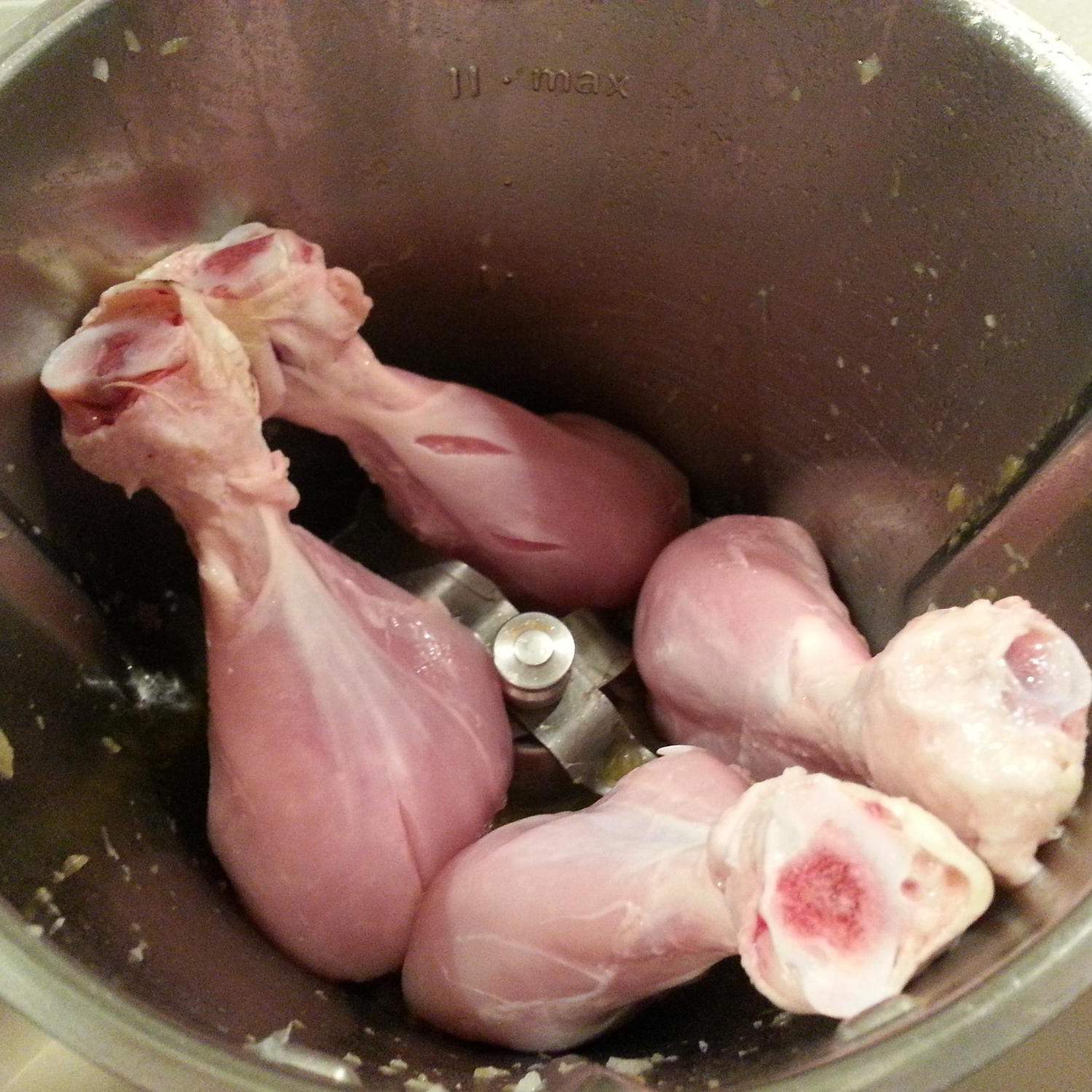 Inserire i fusi di pollo (con la parte larga senza osso verso il fondo) e cuocere 20 min./100°/