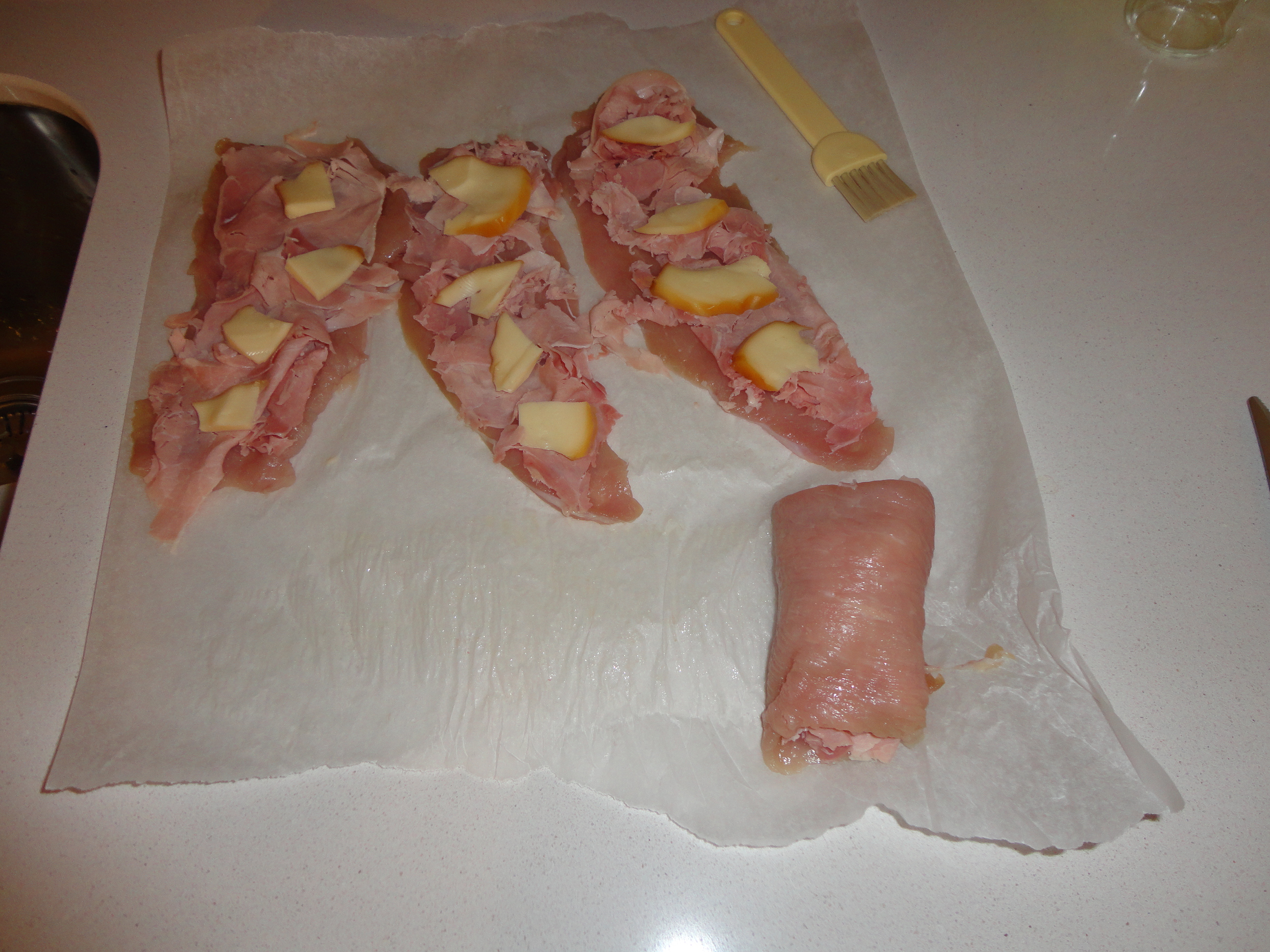 Appoggiare le fettine su un foglio di carta da forno e pennellarle da ambo le parti con un goccio di olio EVO, salarle leggermente e farcirle con il prosciutto cotto e la scamorza a pezzettini. Arrotolarle su se stesse e chiuderle con un pezzo di filo di gavetta.