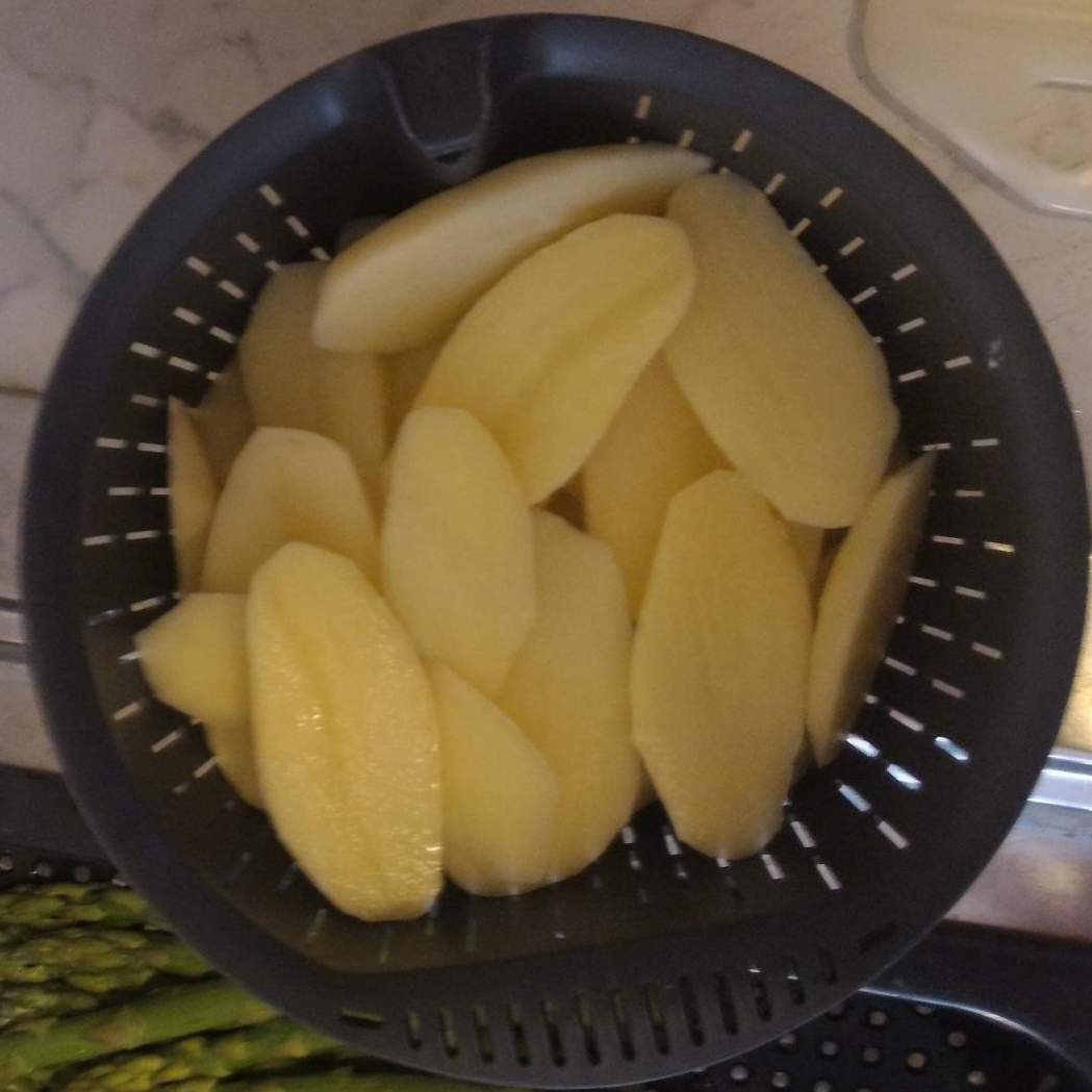 3. Pelare e tagliare le patate a fette e metterle nel cestello. Mettere nel
