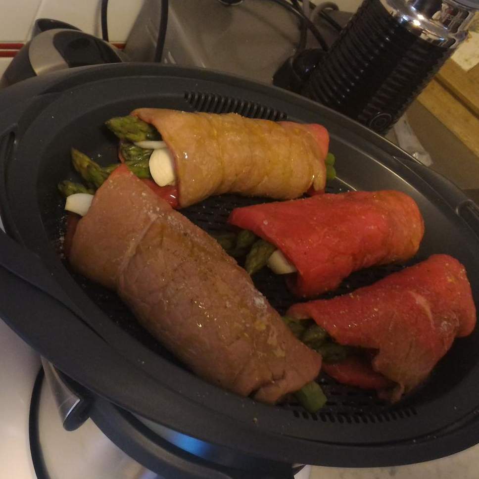 "coperchio chiuso" . Salare, pepare e versare un po' d'olio sugli involtini. Cuocere per 30 min temp varoma vel 1.