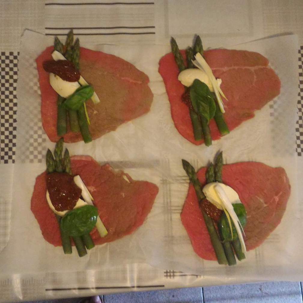 2. Distribuire su ogni fettina 3 asparagi, una fogliolina di basilico, 1/4 di cipollotto, il pomodorino secco, la mozzarella, un po' di sale. Arrotolare e formare gli involtini.