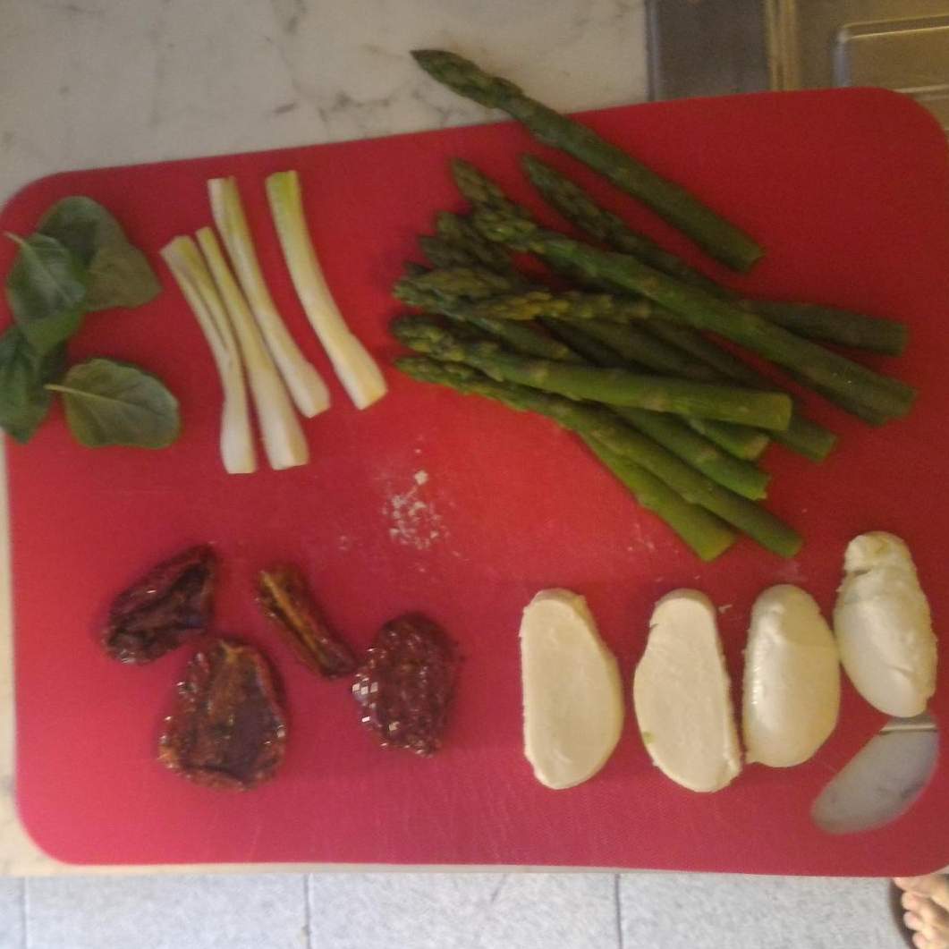 1. Fare una precottura degli asparagi (eliminando l'estremità dura) per 10 min in acqua bollente. Tagliare in 4 il cipollotto e la mozzarella. Lavare e asciugare bene le foglie di basilico.
