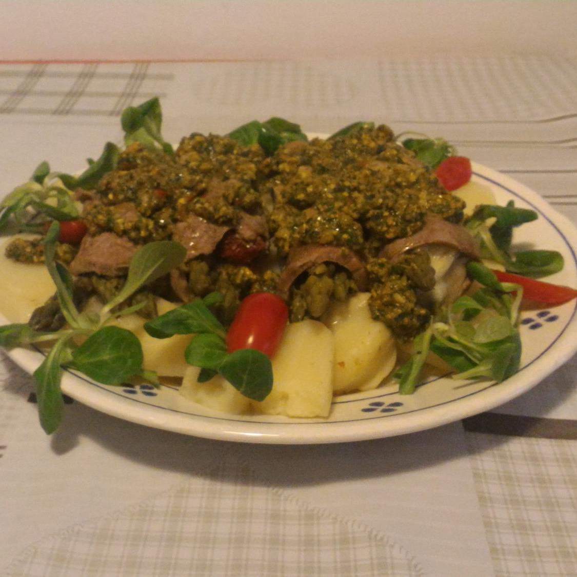5. A cottura ultimata comporre il piatto mettendo le patate alla base, poi gli involtini e sopra il pesto. Guarnire a piacere con foglie di valeriana e pomodorini.