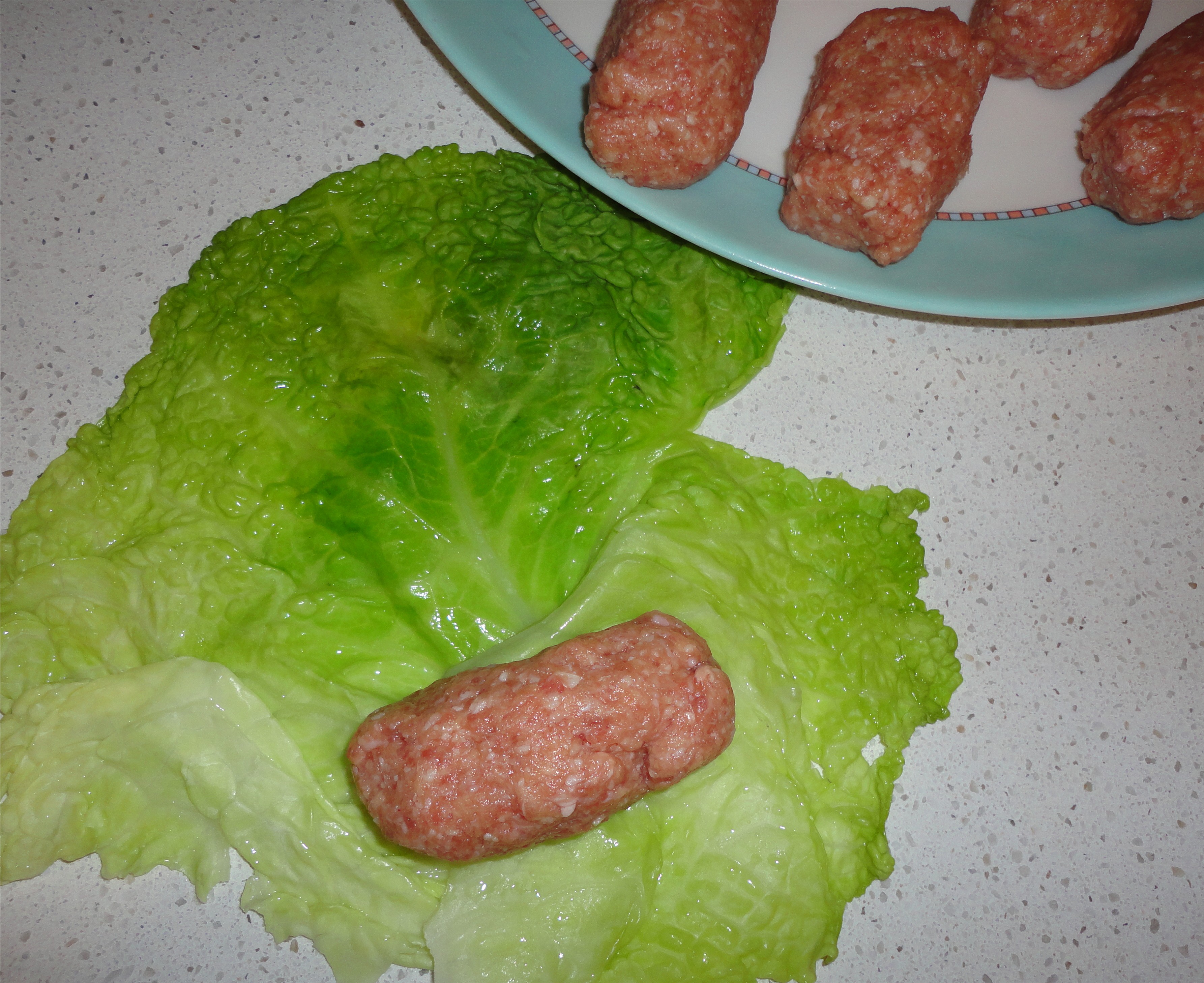 - Adagiare su ogni foglia di verza una polpettina allungata e arrotolare formando degli involtini e fissare con un stecchino.