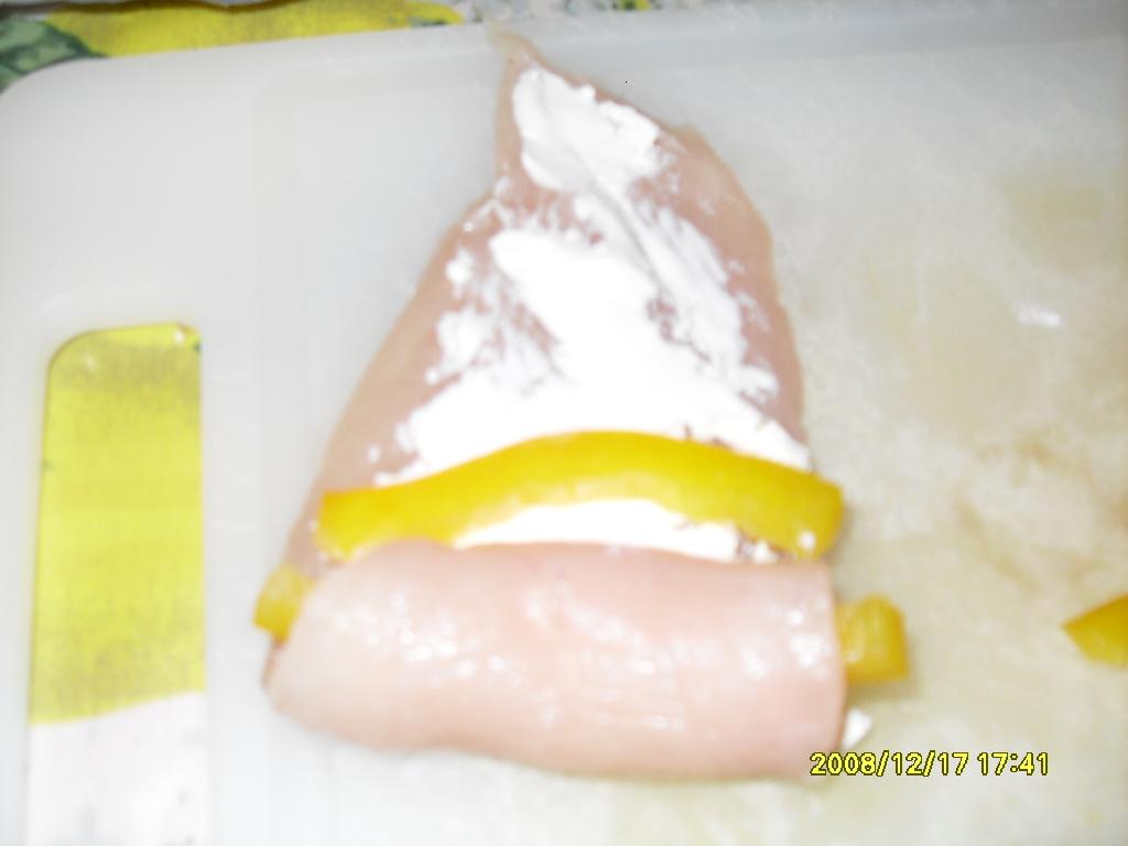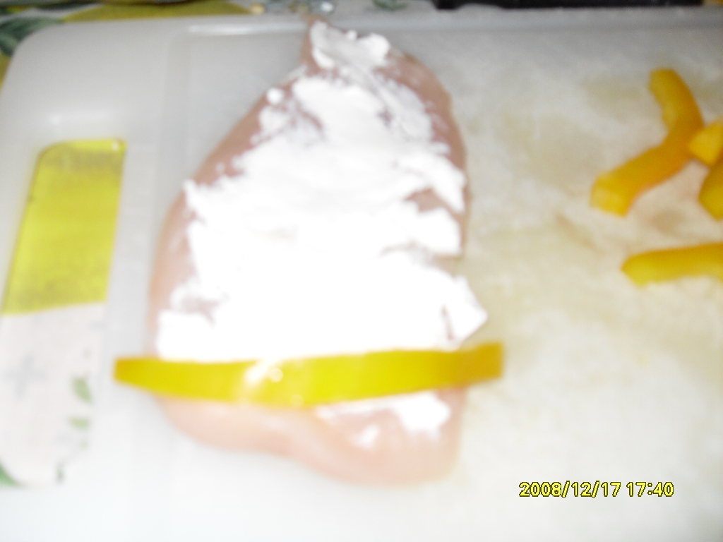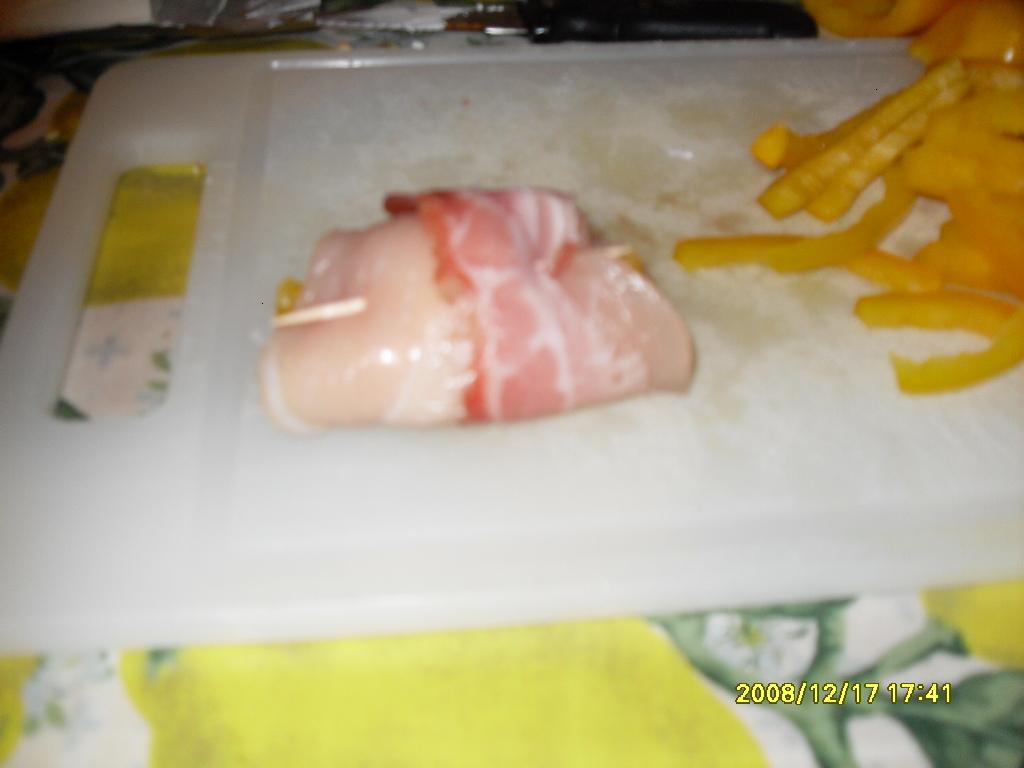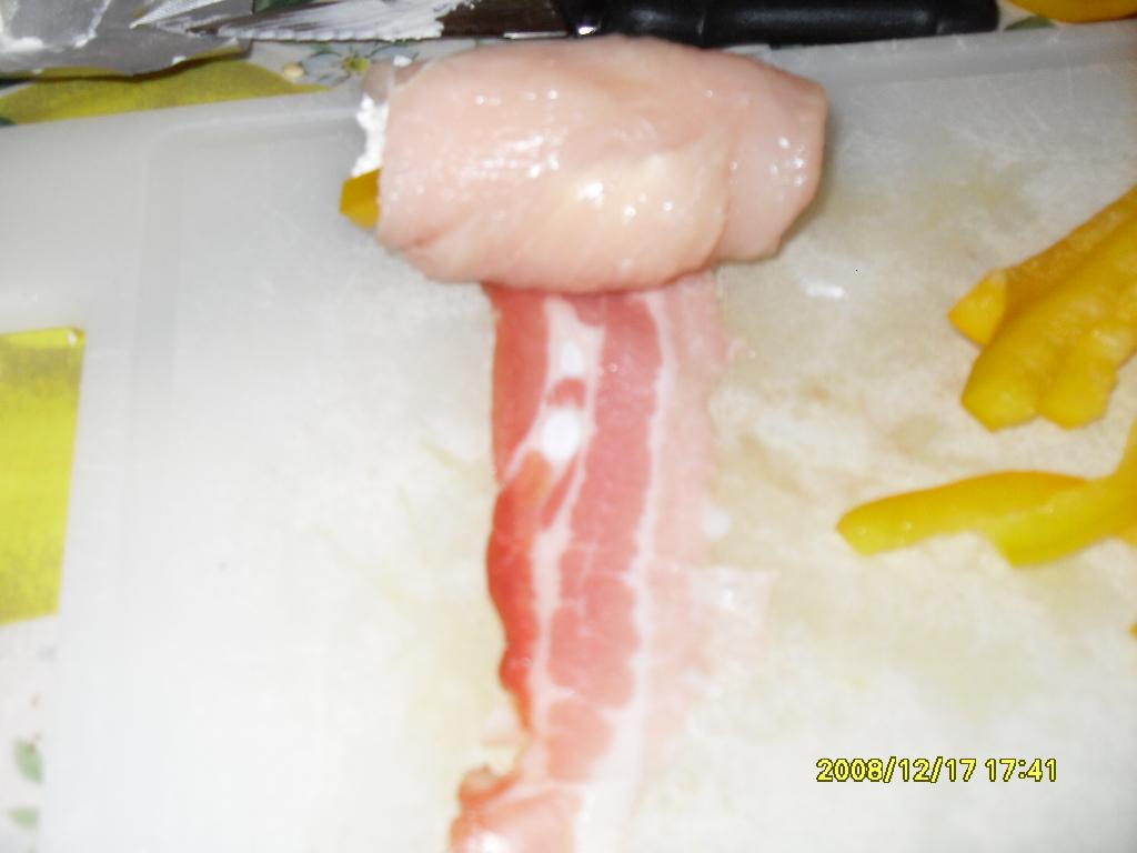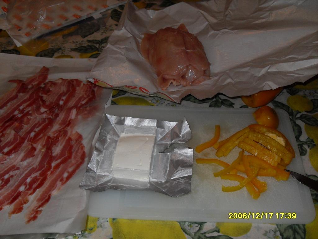 Tagliare il peperone a strisce sottili, spalmare su ogni fettina il philadelphia ed arrotolarle mettendo in mezzo delle strisce di peperone. arrotolare ogni involtino su una fetta di pancetta e fermarla con uno stecchino,