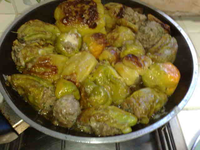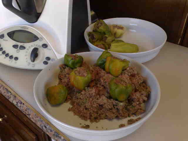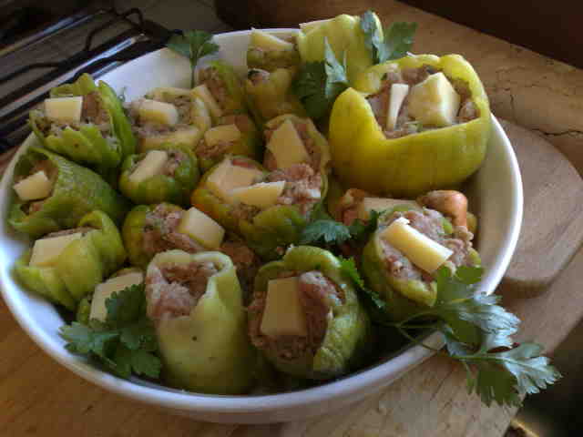 - 10 o 15 peperoni molto piccoli rotondi oppure 4 / 5 peperoni un pò più grandi per il ripieno gr 250 macinato misto manzo o altro ( es. pollo ) gr 250 salsiccia gr 100 emmental gr 50 parmigiano a volontà formaggi ( rimasugli del frigo ancora belli e buoni ) 1 michetta di pane raffermo 1 uovo prezzemolo q.b. 2 spicchi di aglio sale e pepe q.b.