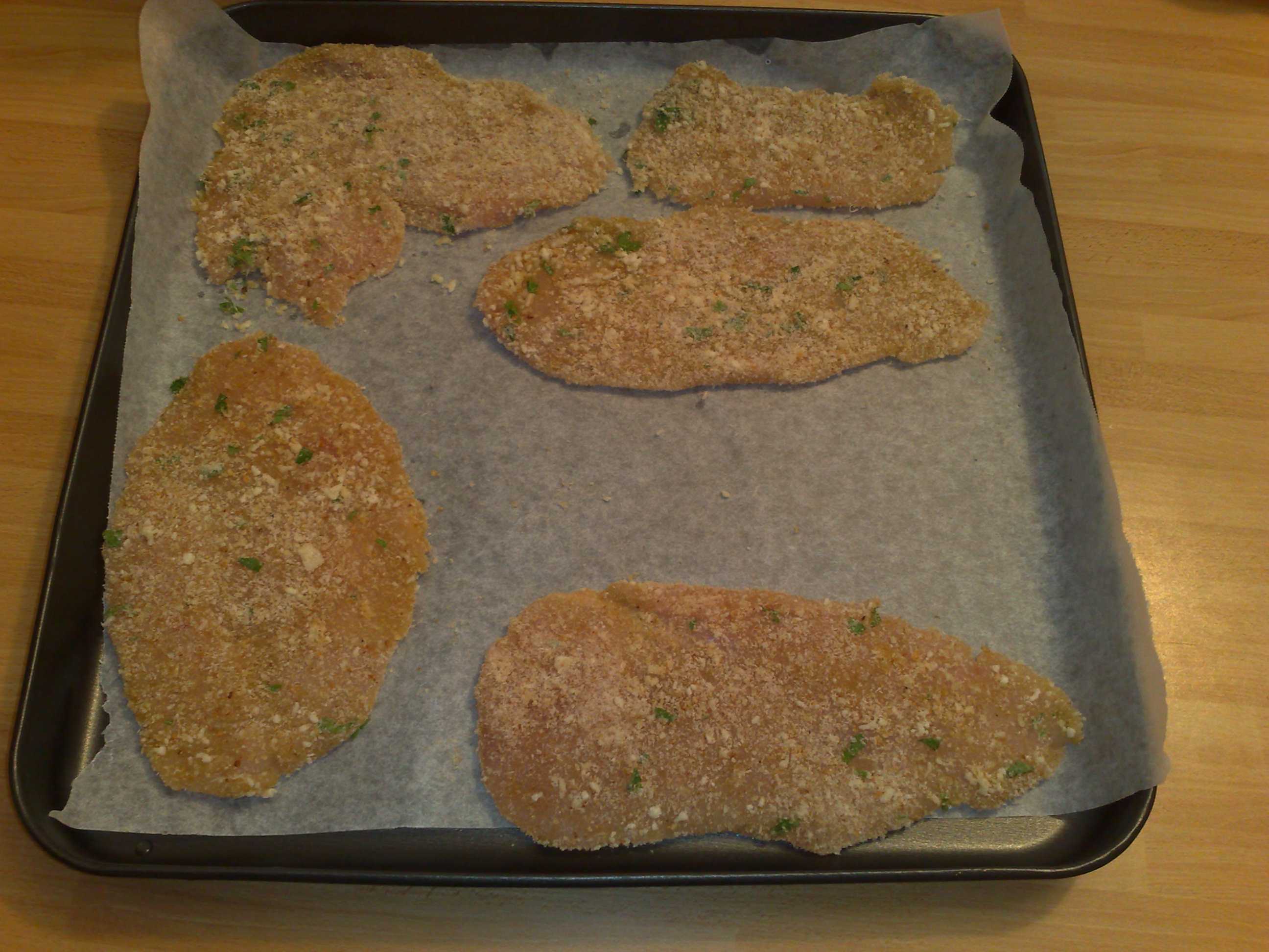 "coperchio chiuso" mettere il pane a tocchetti, il parmigiano, il prezzemolo, la scorza del limone e il sale, tritare tutto 10 sec vel 8. versare su un piatto piano.versare l'olio in un piatto piano, passare le fette di pollo prima nell'olio e poi nel pangrattato condito.