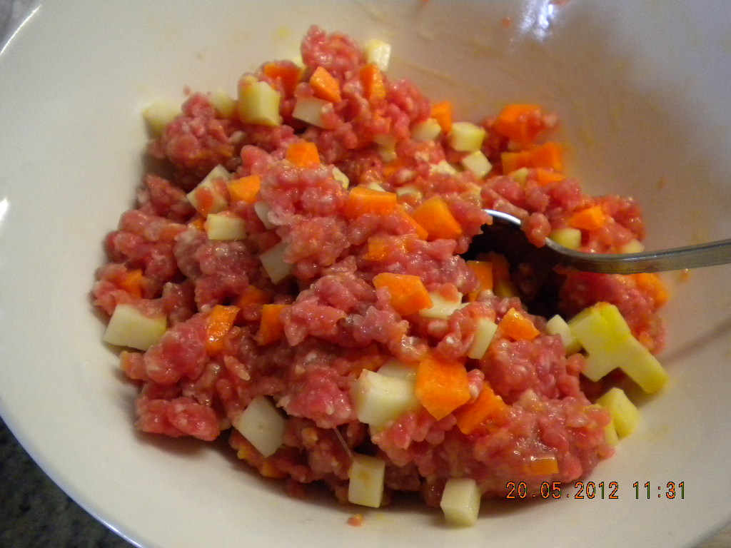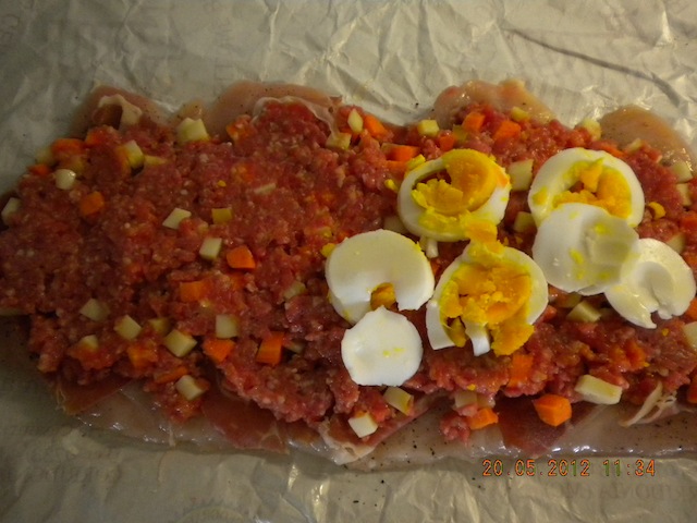 In una terrina unite alla carne macinata 1 uovo, pizzico di sale, scamorza e carota a dadini e stendetela sul petto di pollo.