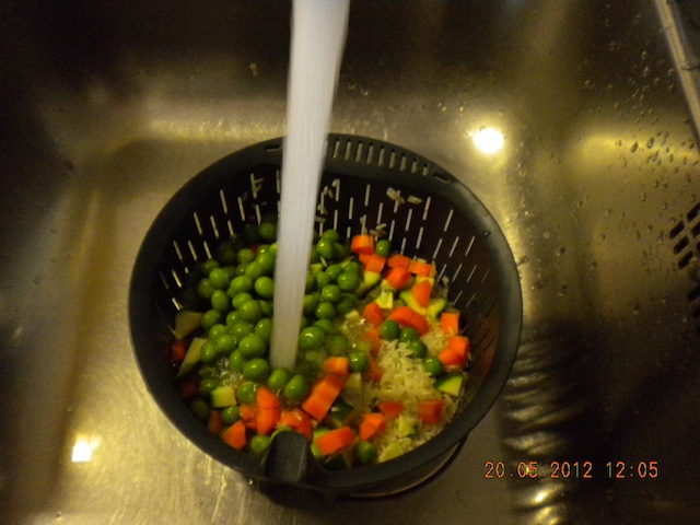 "velocità soft" .Nel cestello sistemate il riso, la carota la zucchina a dadini e i piselli, passate il tutto sotto l'acqua, inaserite il cestello e posizionate il varoma.