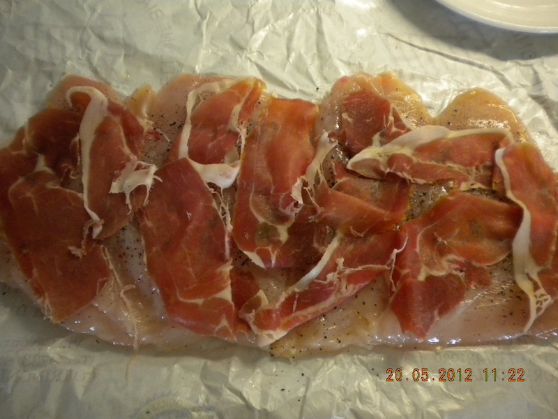 Dal macellaio fatevi tagliare e battere un petto di pollo, salatelo, io ho usato il sale nero di Cipro e sistemate le fette di prosciutto o speck.