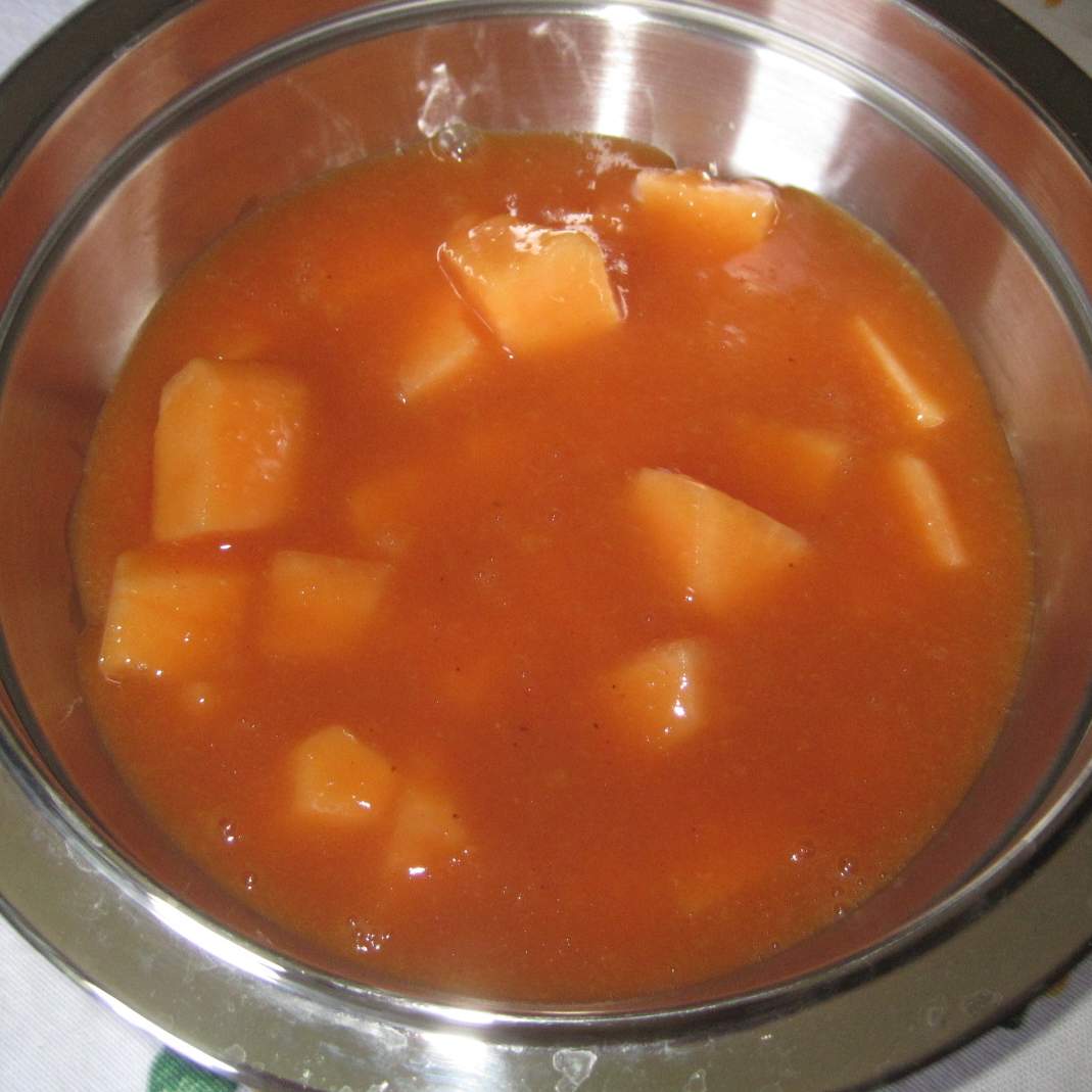 "coperchio chiuso" .In un bicchiere diluire l'amido di mais con il brodo tiepido e aggiungerlo al melone frullato con l'aceto, il concentrato di pomodoro e lo zucchero di canna.