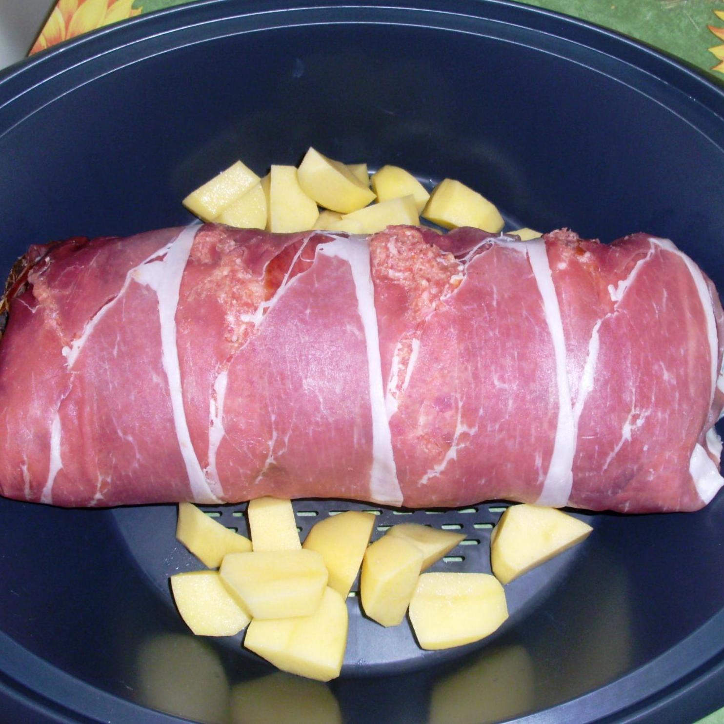 Togliere il composto,versare sopra lo speck alliniato una fetta accanto al'altra e mettere al'interno prosciutto e formaggio e dare la forma al polpettone avvolgerlo con le fettine di speck.Adagiare il polpettone nel varoma e aggiungere le patate a tocchetti,