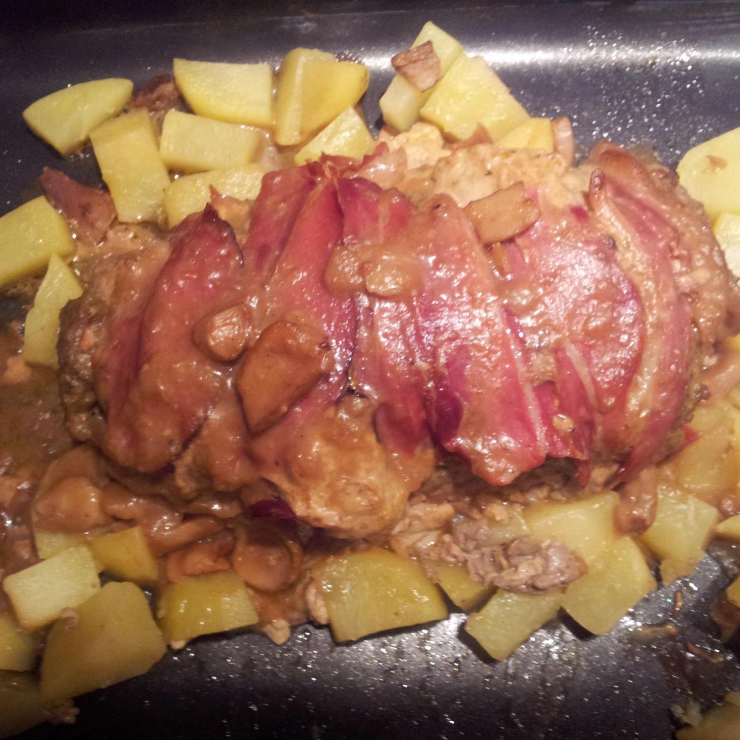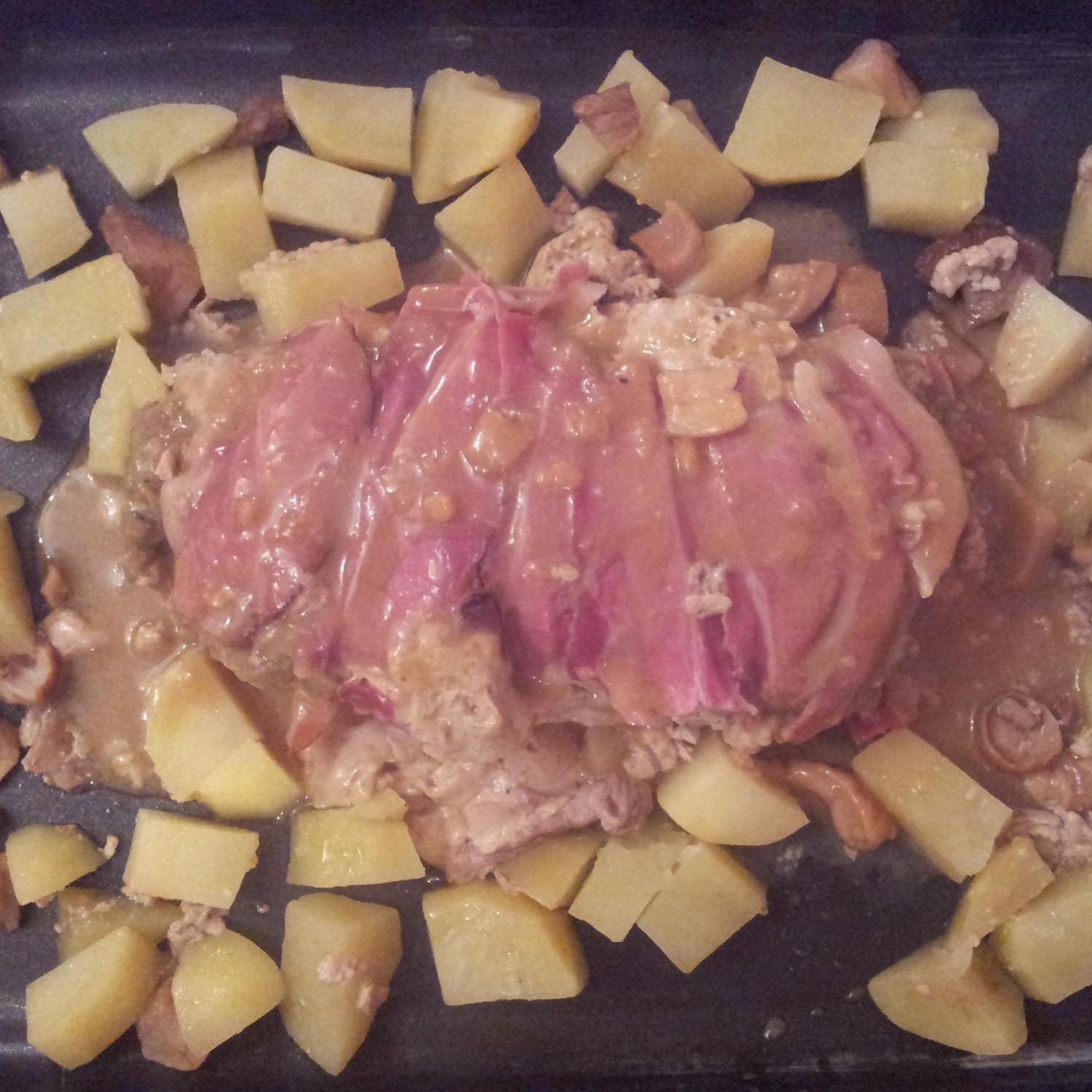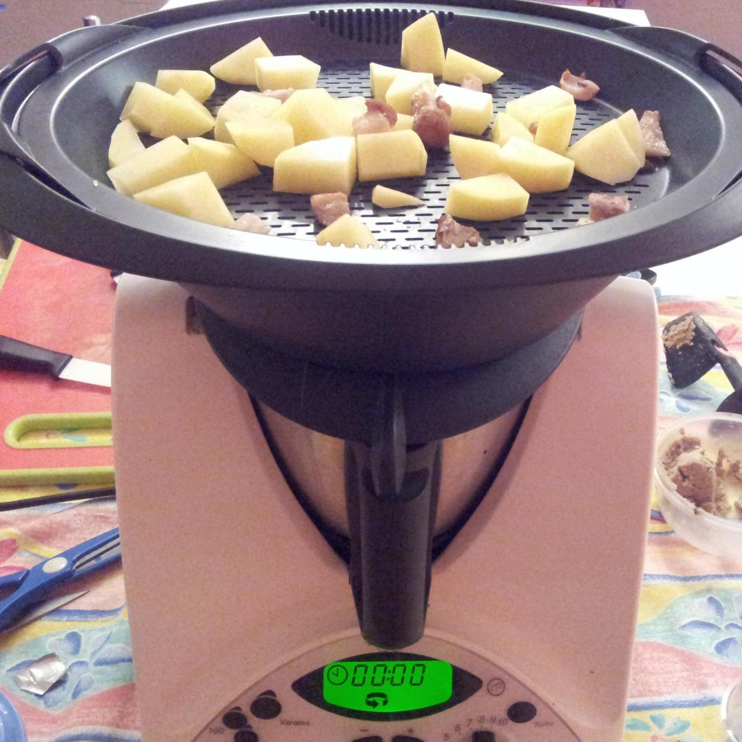 Mettere il polpettone con le patate a tocchetti e metà dei funghi surgelati nel Varoma.