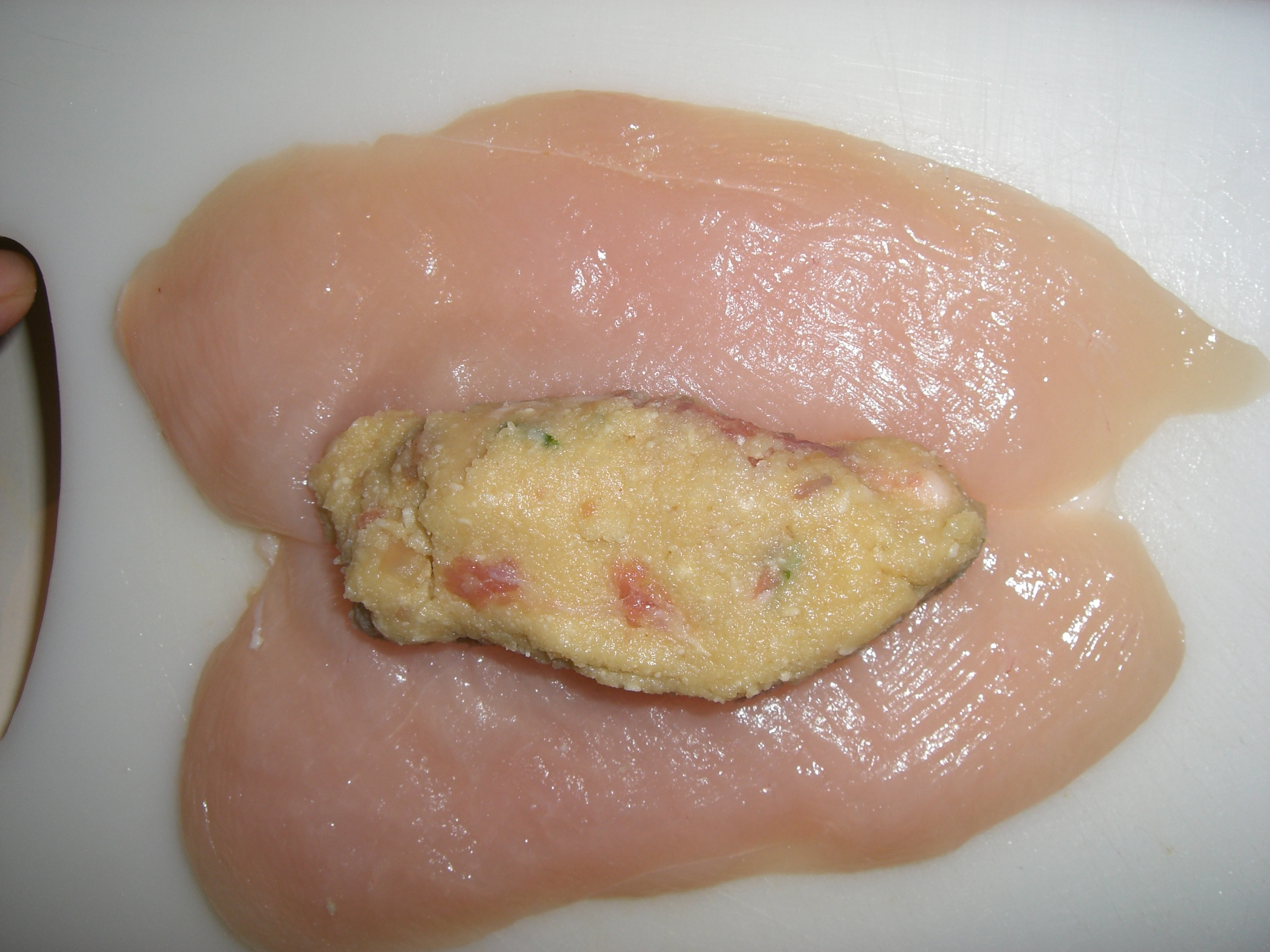 - Stendere su un piano le fette di petto di pollo e dividere il ripieno sulle varie fette in parti uguali.
