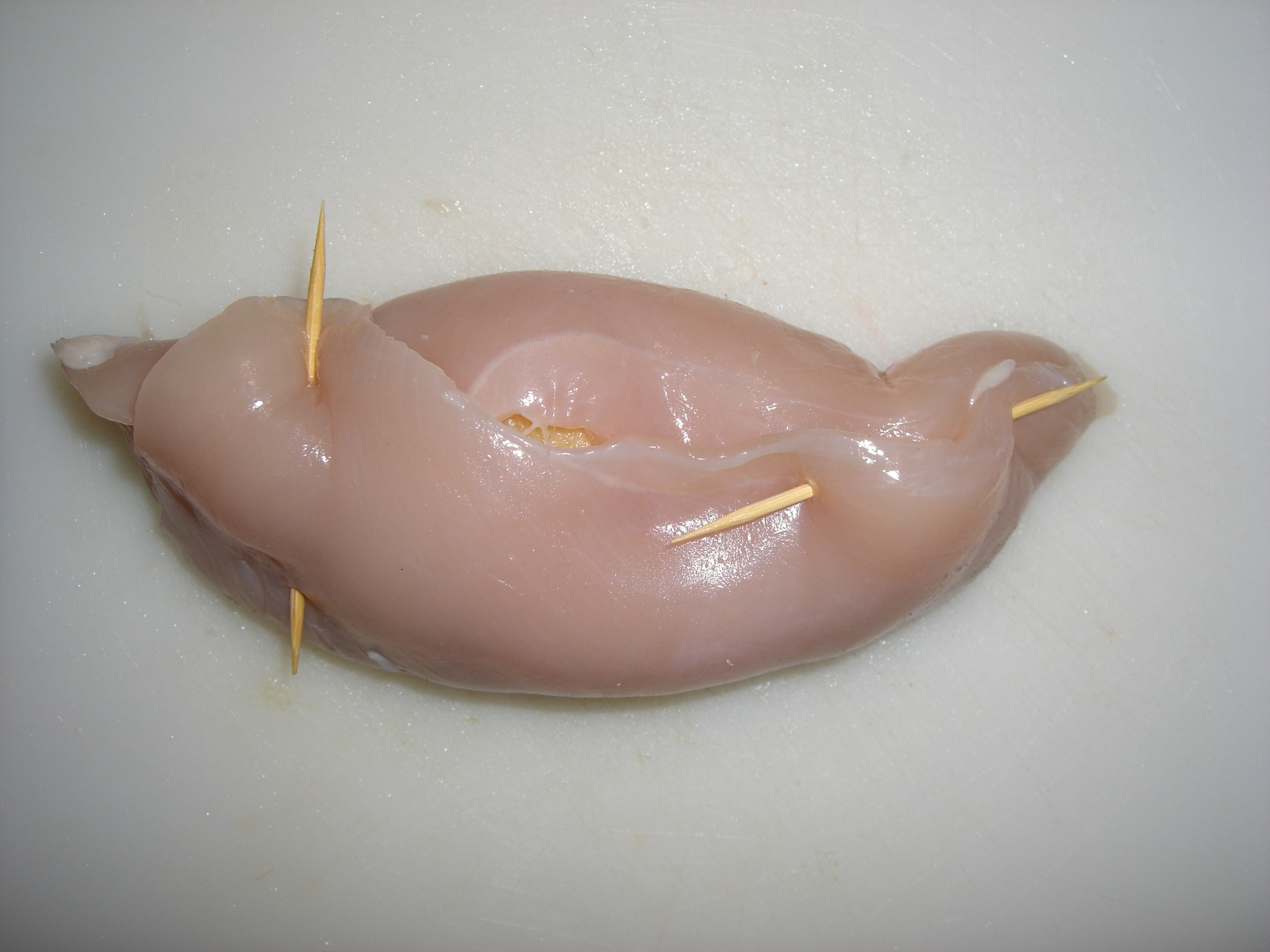 - Se siete riuscite ad affettare il petto di pollo lasciandolo intero avrete una fetta simile ad un cuore è sufficiente piegarla in due e chiudere un lato con gli stuzzicadenti, se avete più fettine sovrapporre una all'altra e chiudere tutti i lati con gli stuzzicadenti. A me son venuti 4 involtini.