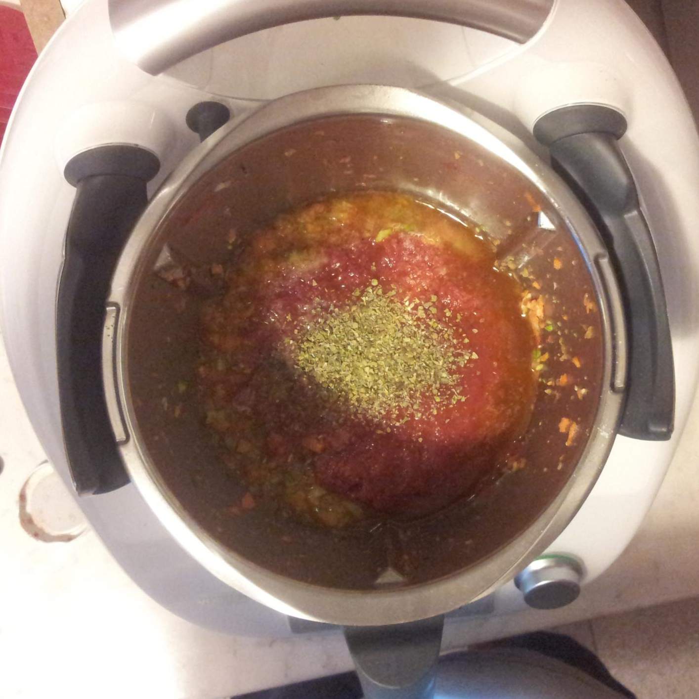4. 3. Preparare il sugo: mettere nel coperchio chiuso"coperchio chiuso" la cipolla, la zucchina, il peperone, la carota nel coperchio chiuso"coperchio chiuso" , tritare per 10 sec a vel 6. 4. Aggiungere l'olio e soffriggere per 3 min 100° vel 1. 5. Aggiungere la passata di pomodoro, il sale, il pepe, l'origano e l'acqua. Chiudere il boccale