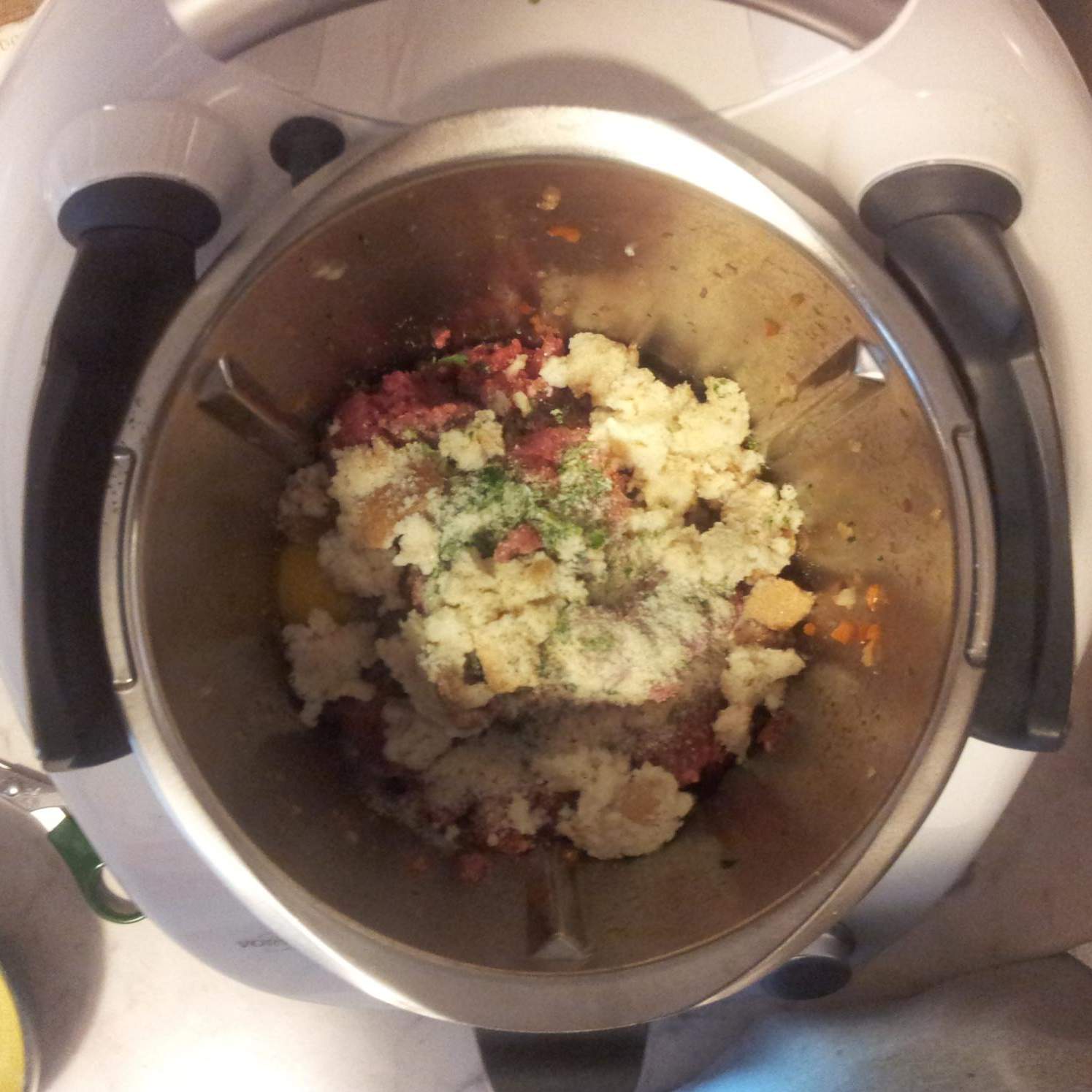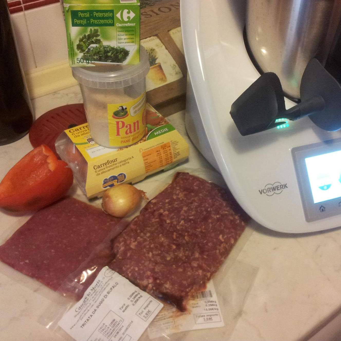 3. 1. Mettere la cipolla e il peperone nel coperchio chiuso"coperchio chiuso" , tritare per 10 sec a vel 6. 2. Aggiungere la carne tritata, l'uovo, il pangrattato, la fetta di pancarrè precedentemente ammollata nel latte e poi strizzata, il sale, il pepe e il prezzemolo. Mescolare per 30 sec a vel 4. Mettere il composto in una terrina e preparare le polpette ungendosi un po' le mani. Posizionarle nel recipiente e nel vassoio del Varoma.