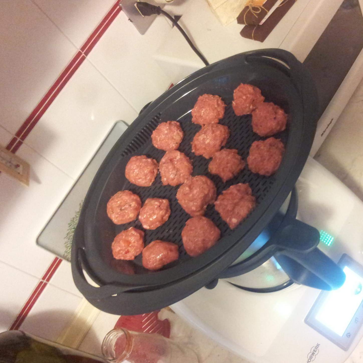 5. 6. Posizionare il Varoma. Cuocere per 30 minuti temp Varoma vel 1.  Mettere le polpette su un piatto di portata e coprire con il sugo ottenuto