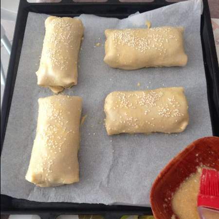 Con impasto ottenuto precedentemente formare 4 palline e stendere sul piano di lavoro a forma di un disco. Spalmare ogni disco con un cucchiaio di salsa e posizionare il polpettone. Avvolgerlo nel impasto formando un fagottino. Richiudere bene. Spennellare con l'uovo sbatutto e spolverizzare con semi di sesamo.