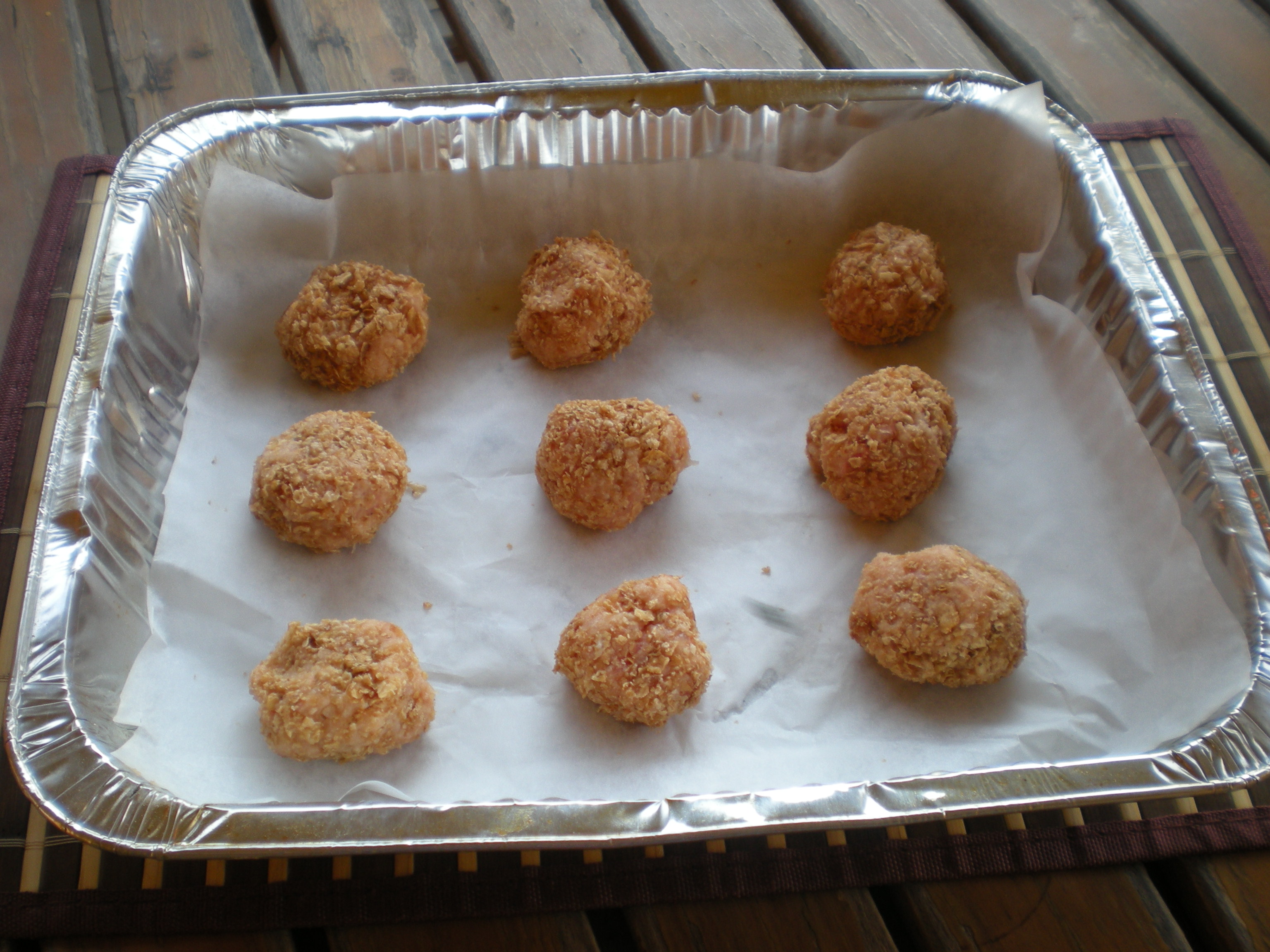"coperchio chiuso" le carni a pezzetti 10 sec vel 7, aggiungere le patate, il parmigiano, le uova, il sale e il pepe 20 sec vel 6. Ricavare delle palline e rotolarle nel cornflakes .Disporre le polpettine in una teglia coperta da carta da forno e infornare per 20m nel forno preriscaldato a 190°. Si possono servire sia calde sia fredde.