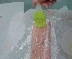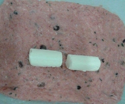 Disporre i caprini dal lato più lungo, uno accanto all'altro, a circa 4/ 5 cm dal bordo - 9) Arrotolare in modo stretto il composto intorno ai caprini, formando un polpettone infarinare e spennellare con un po' di olio infine avvolgere in carta da forno e legare con spago da cucina