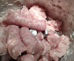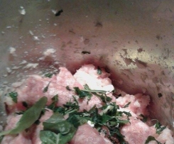 5) Aggiungere la salsiccia di pollo privata dalla pelle - 6) Mettere nel boccale le erbe aromatiche sminuzzate quindi prezzemolo, basilico, erba cipollina, salvia, rosmarino aglio e 40 gr di olive taggiasche, tritare: 10 sec/ vel 10