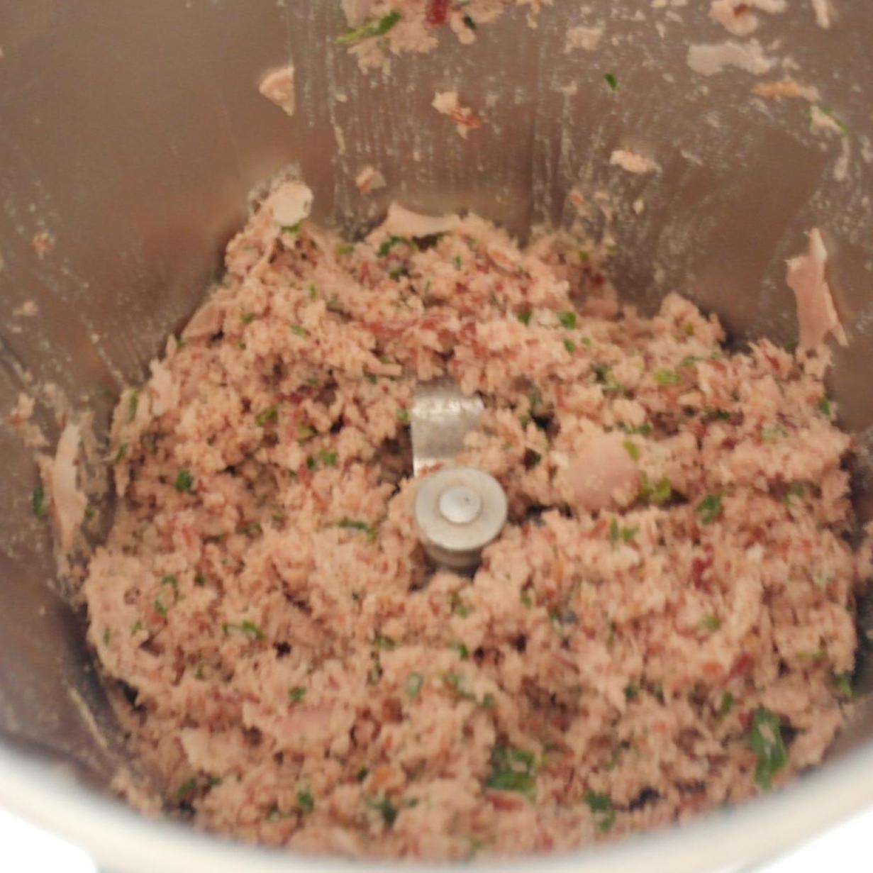 Mettere nel boccale il prosciutto, speck, mortadella e tritare: 10 sec vel 5.
