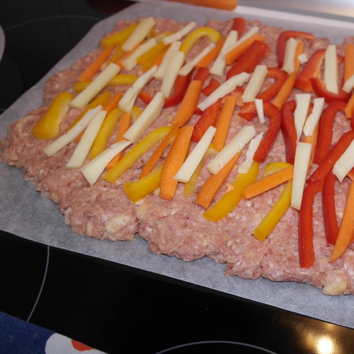Stendere l'impasto sulla carta forno e coprire con peperoni, formaggio e carote a julienne.