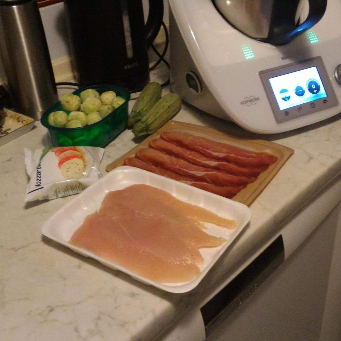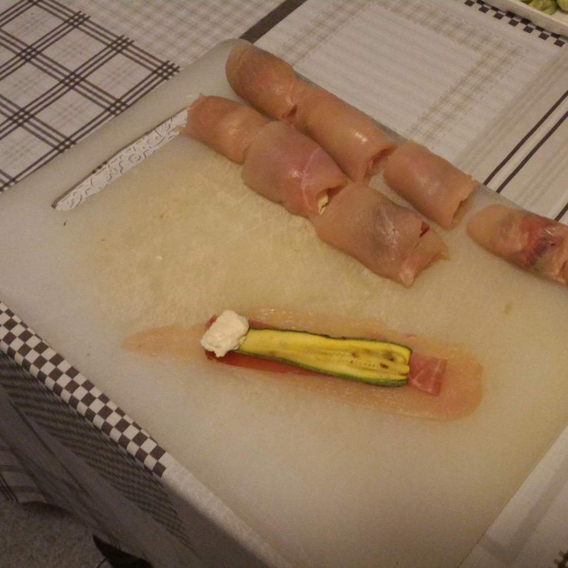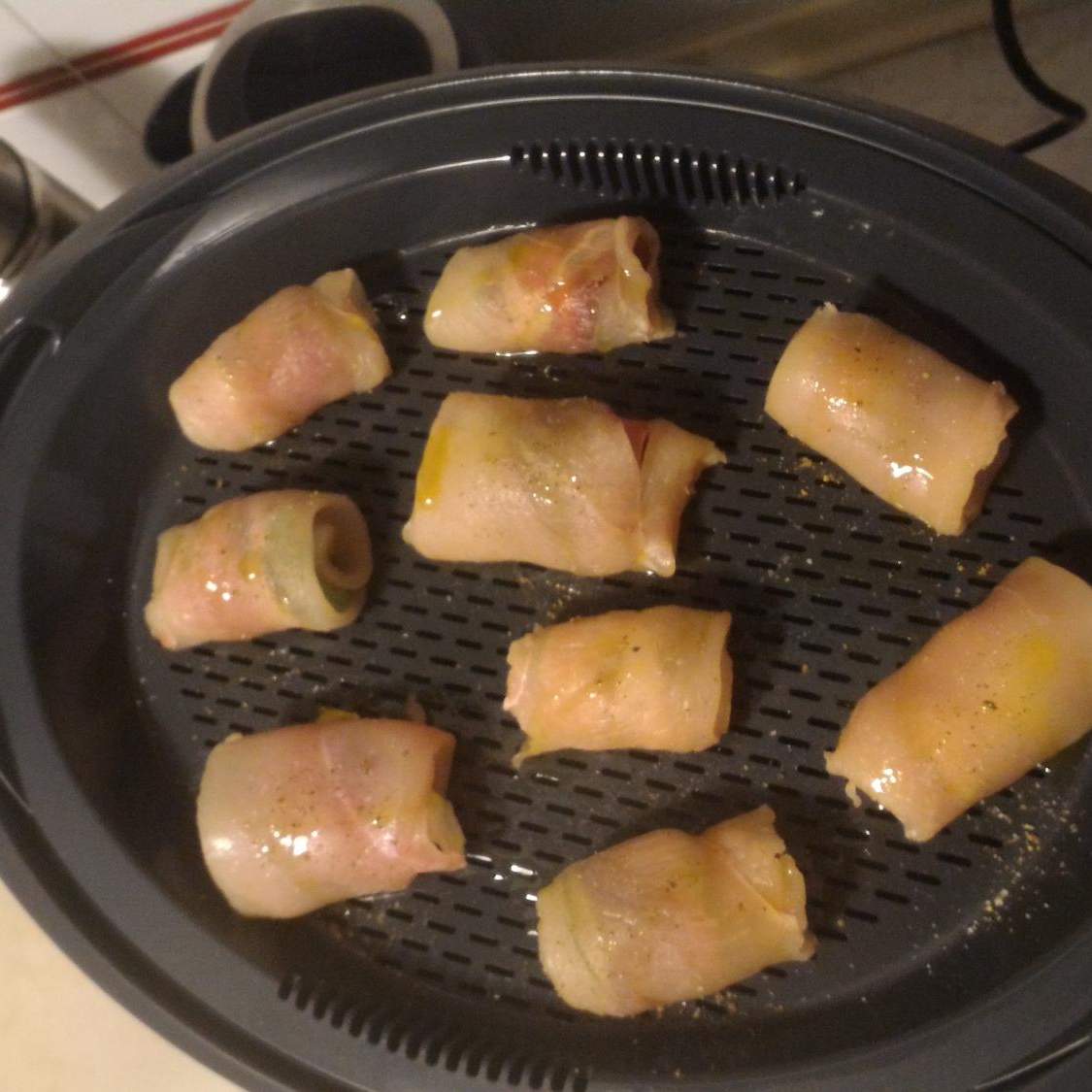 3. Comporre le rolatine: posizionare sulla fettina di pollo lo speck, una fettina di zucchina e una parte di mozzarella. Arrotolare su se stessa. Ungere leggermente il vassoio del Varoma e posizionare le rolatine, condire con sale, pepe e un po' d'olio.