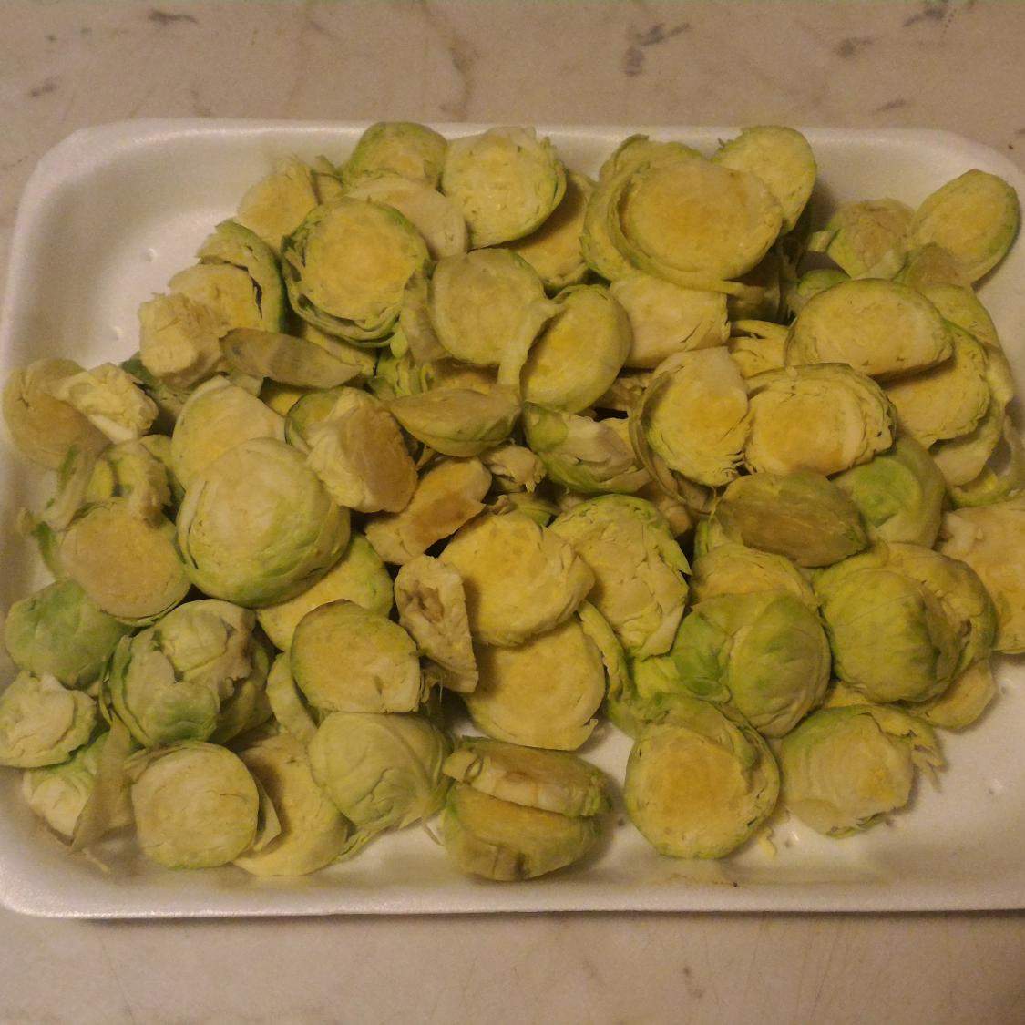 2. Pulire e tagliare a fettine i cavolini di Bruxelles. Tagliare le due zucchine ricavando otto fettine, sbollentarle per 30 secondi in acqua bollente. Tagliare in 8 parti uguali la mozzarella.