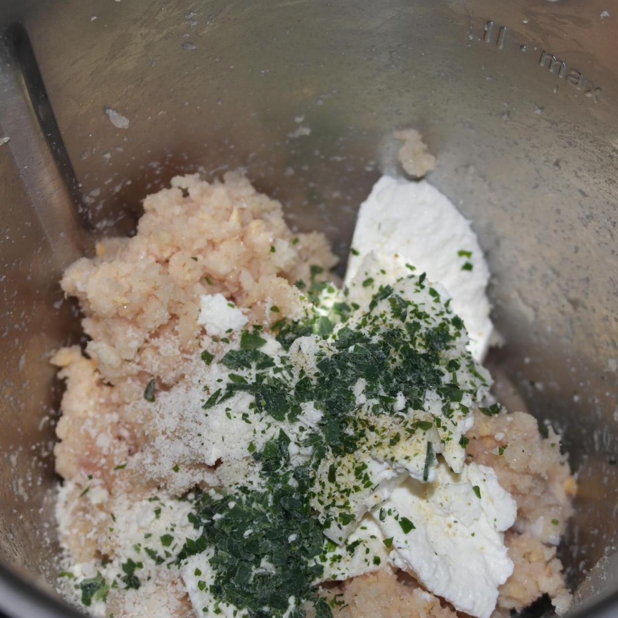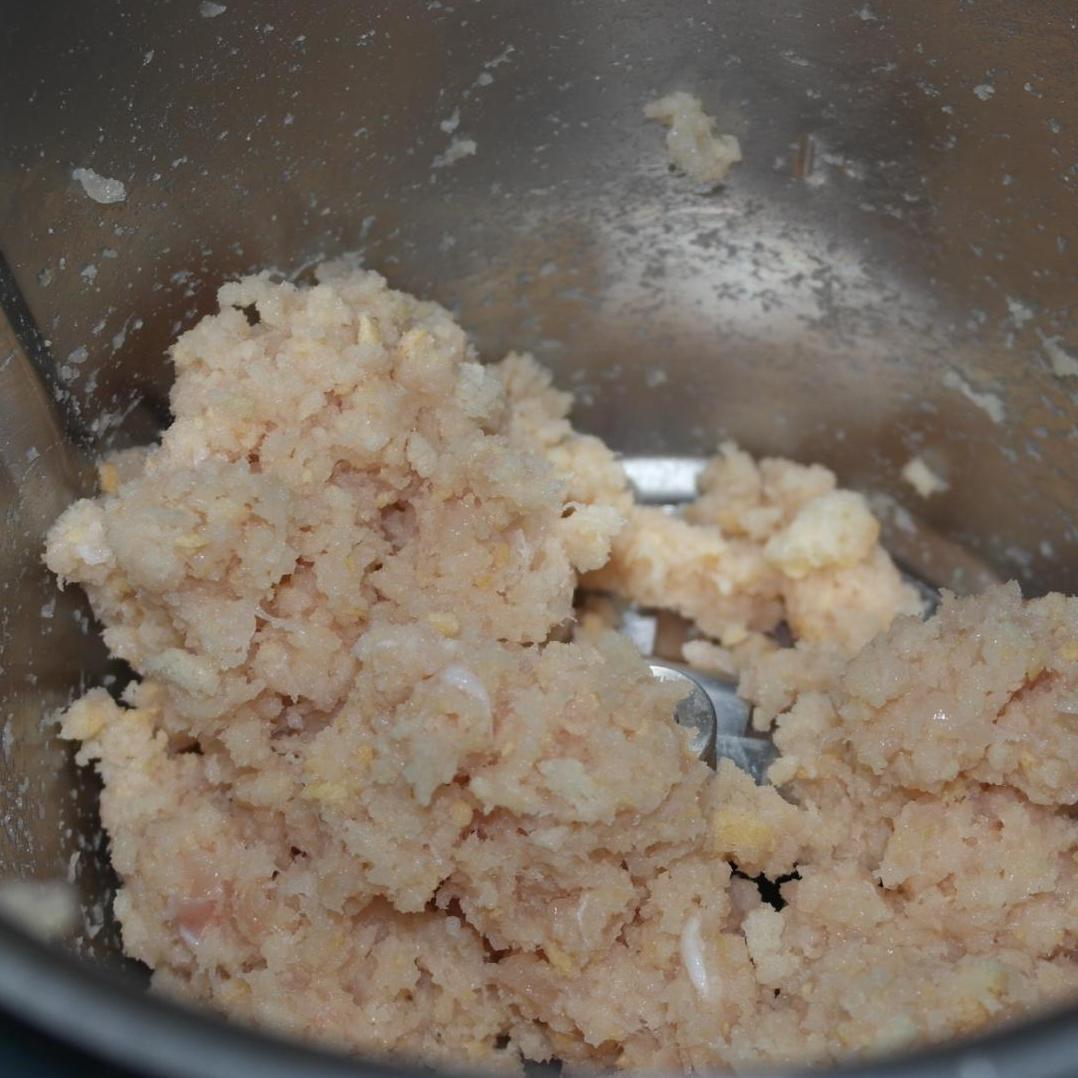 1. Mettere nel coperchio chiuso"coperchio chiuso" pollo e pane a pezzetti e tritare: 10 sec vel 8