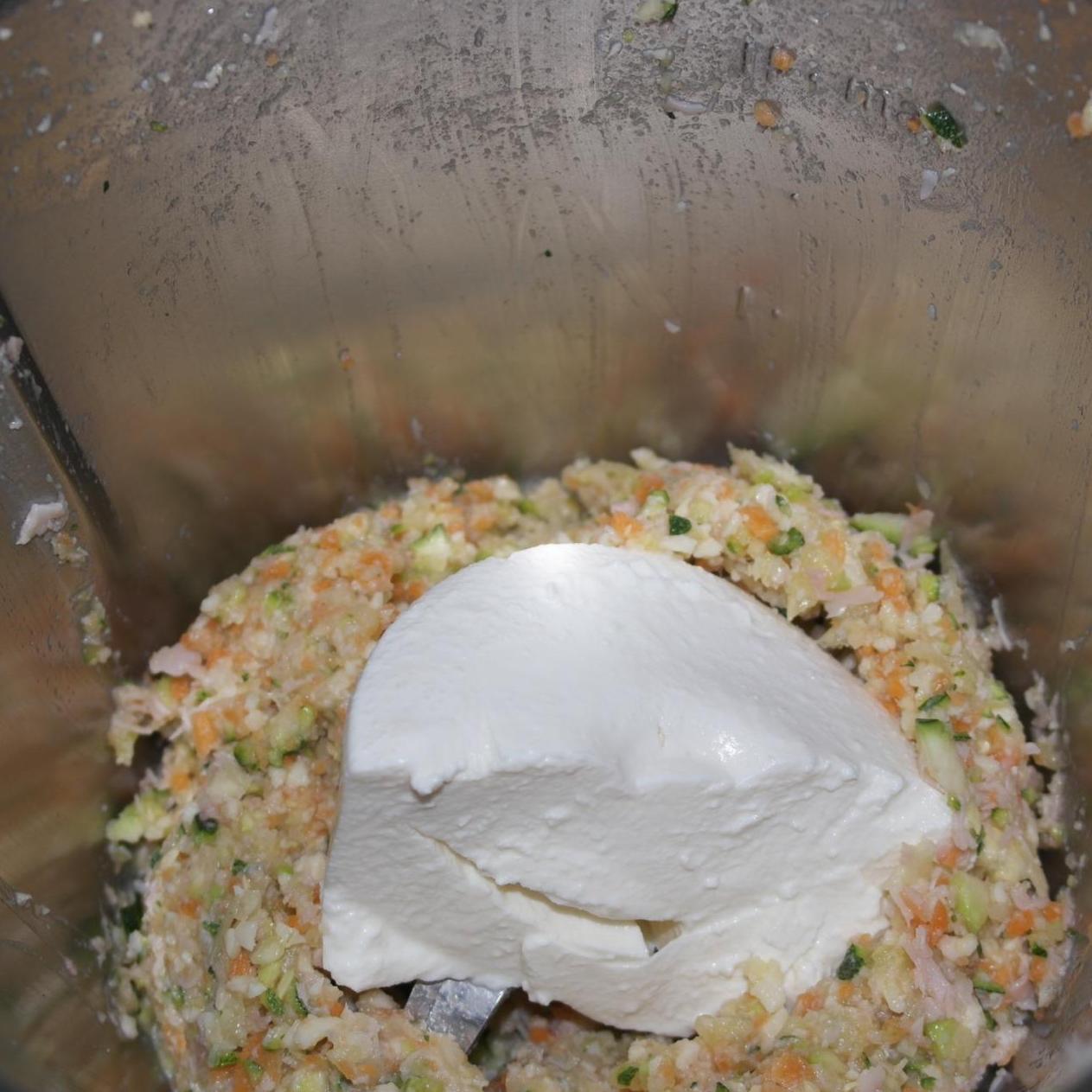 5. Tritare cipolla, prosciutto, zucchina, carota e formaggio: 10 sec vel 6.