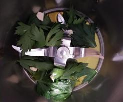 2. 2. Mettere nel coperchio chiuso"coperchio chiuso" l'aglio, il prezzemolo e l'olio. Tritare per 7 sec a vel 7. Riunire sul fondo con la spatola. Soffriggere per 3 min 120° vel 1.
